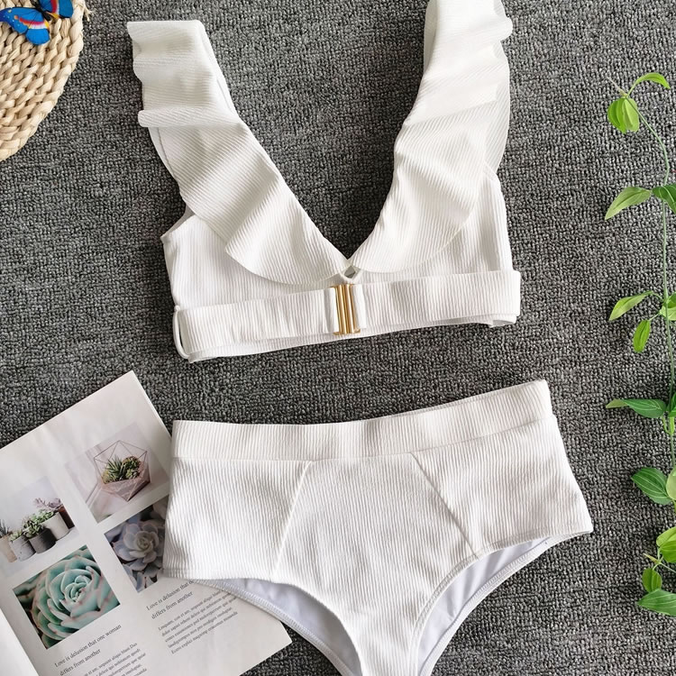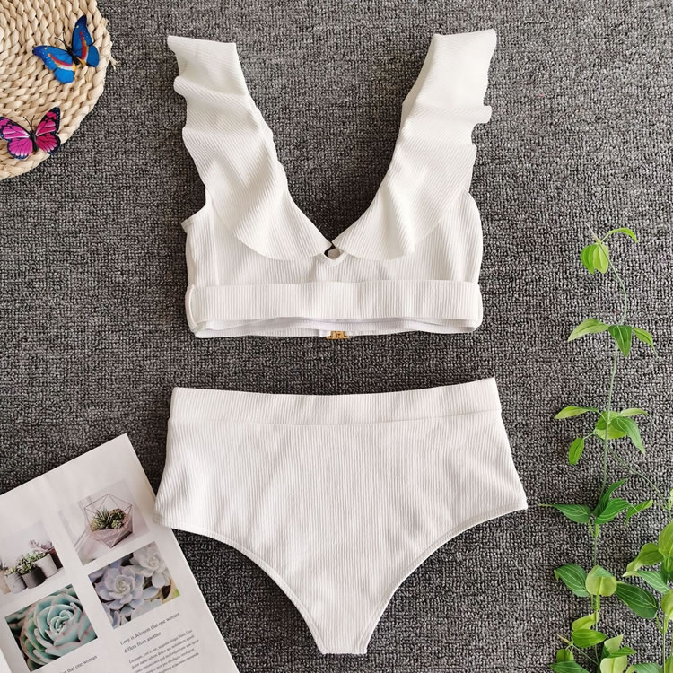 Put your mind at ease with the ocean breeze in this sexy two piece swimsuit featuring a scoop neckline with a ruffled trim, a comfortable ribbed fabric, and a matching high waisted bottom with a cheeky cut back.