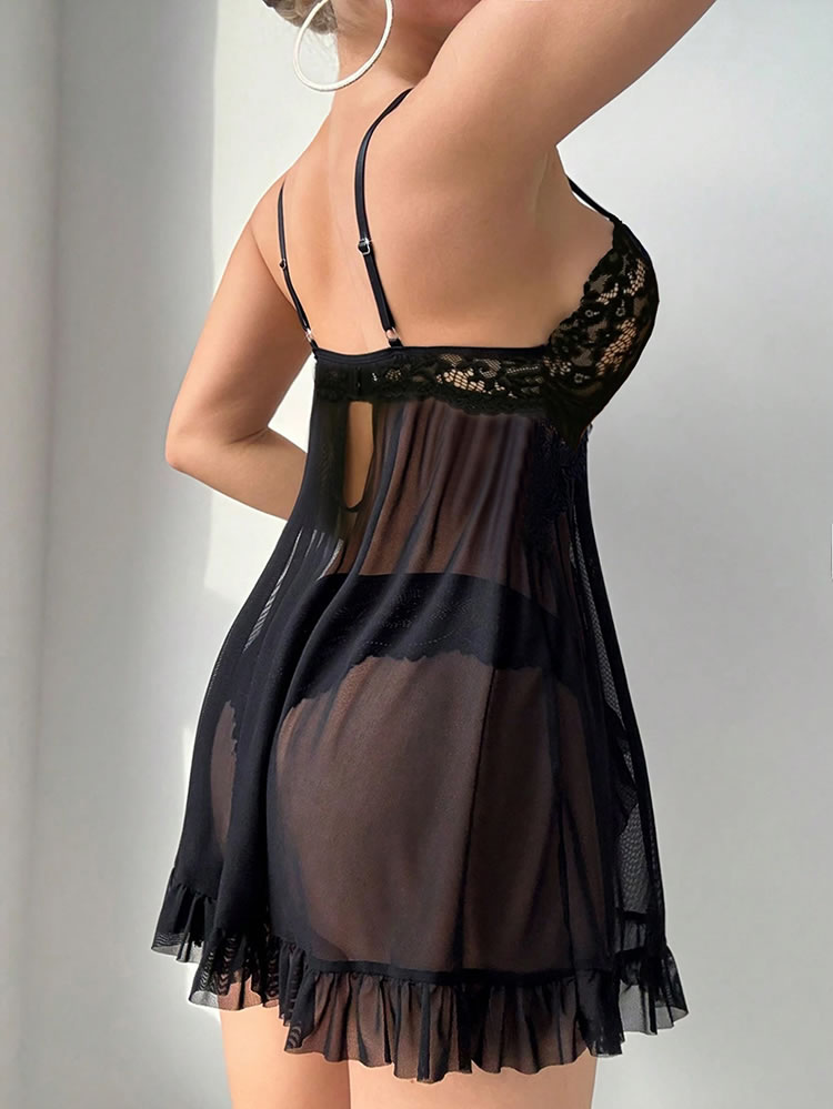 This exquisite lingerie set is designed to captivate with its elegant and seductive design. The deep V-neckline is adorned with intricate black lace, adding a touch of sophistication and allure. The sheer mesh fabric enhances the overall allure, providing a sultry and romantic look. Adjustable spaghetti straps ensure a comfortable fit, while the flared skirt with ruffled hem adds a playful and charming finish. The central satin bow detail at the bust adds a subtle yet captivating element, making this set perfect for special intimate moments.