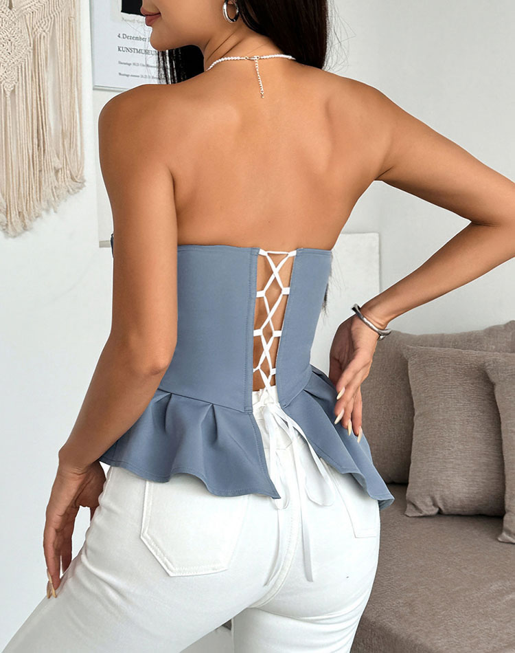 This elegant blue bustier features a sophisticated lace overlay that adds a touch of femininity and charm. The structured design accentuates the waistline, creating a flattering silhouette. Perfect for adding a stylish edge to any outfit, whether you're heading out for a night on the town or attending a special event.