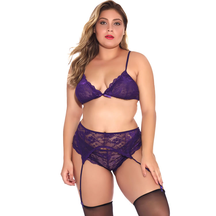 This elegant bra set features soft lace cups, satin bow accents, adjustable spaghetti straps, a hook and eye back closure, a matching garter belt with adjustable garter straps, and a matching panty with a cheeky cut back. (Thigh high stockings not included.)