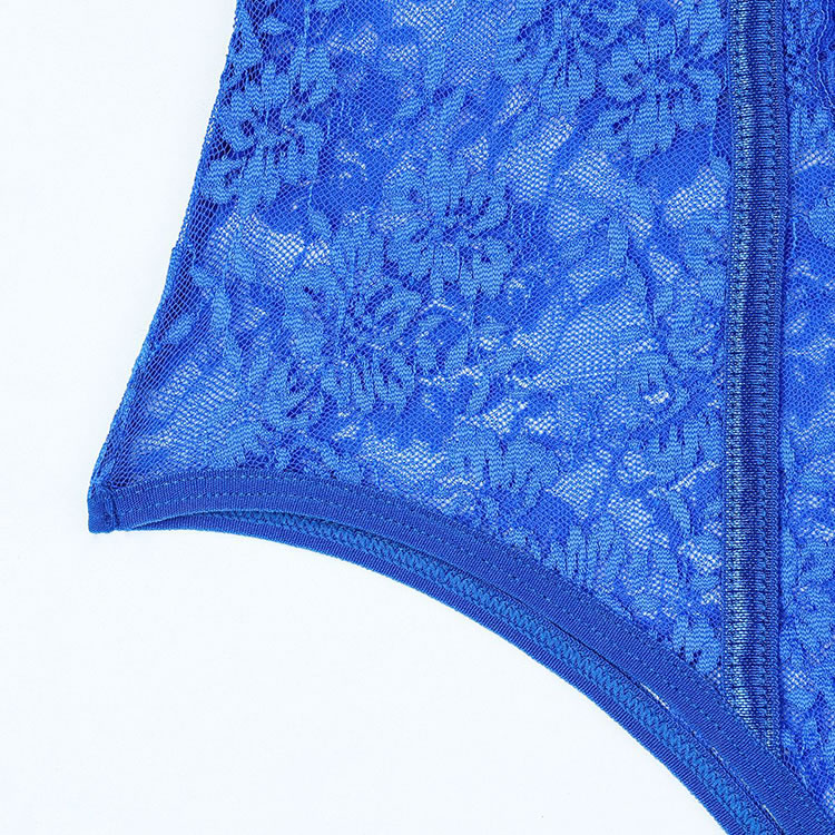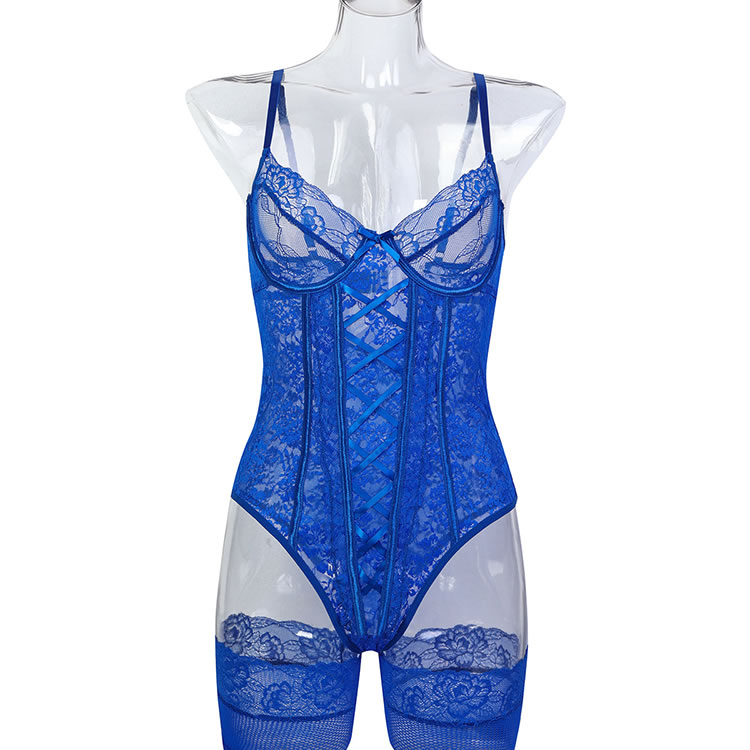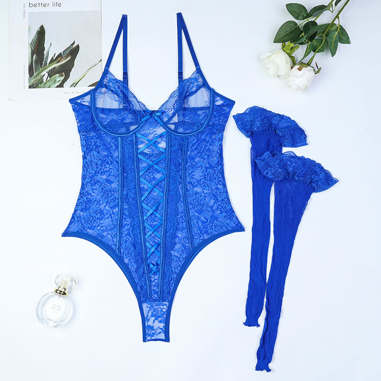 Surrender to seduction in this stunning teddy, featuring sheer lace underwire cups with strappy bust accents, adjustable spaghetti straps, and a sheer lace bodice. The look is completed with adjustable garter straps, a thong cut back, and matching thigh-high stockings, making it perfect for a night of romance.