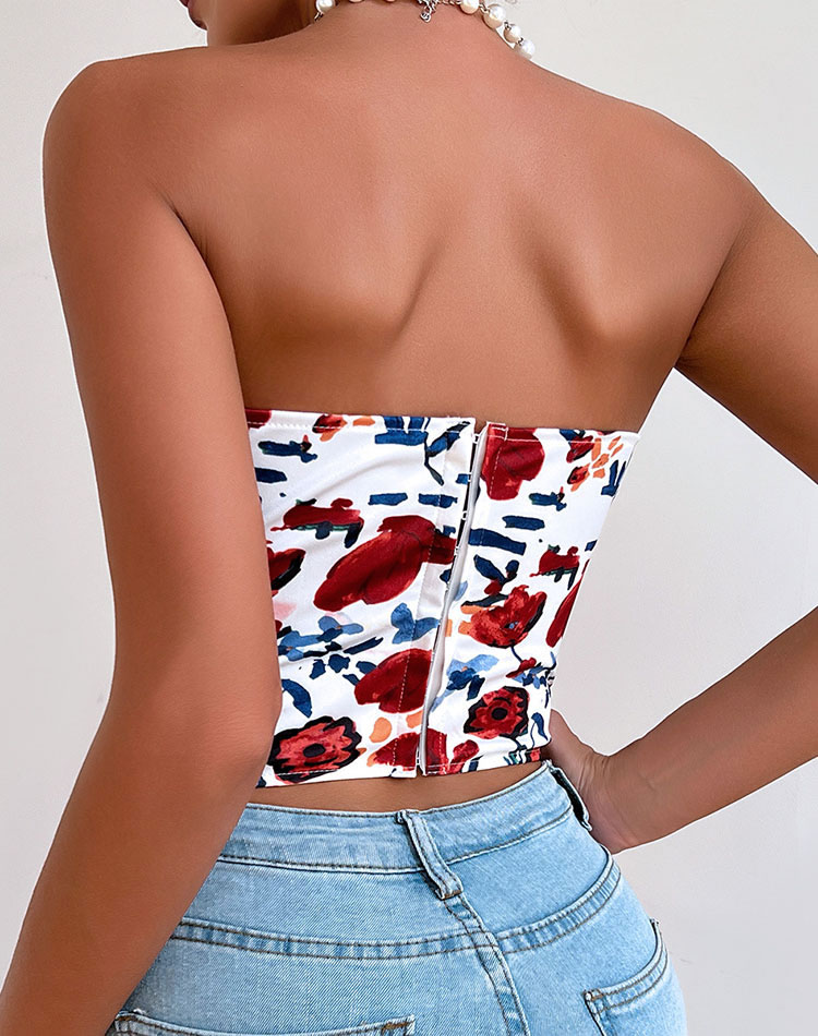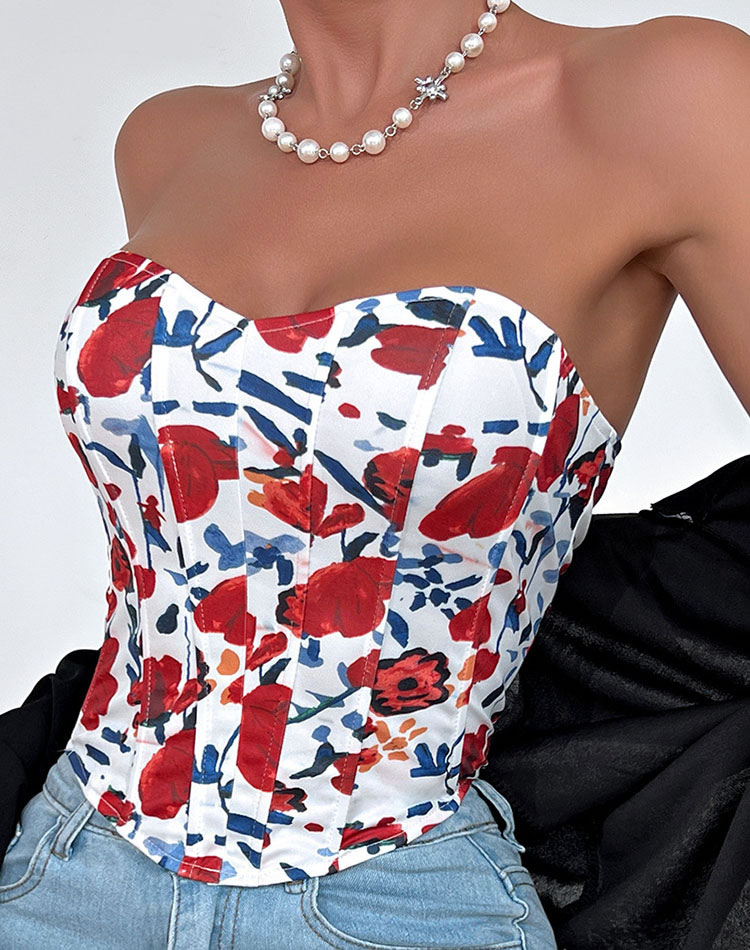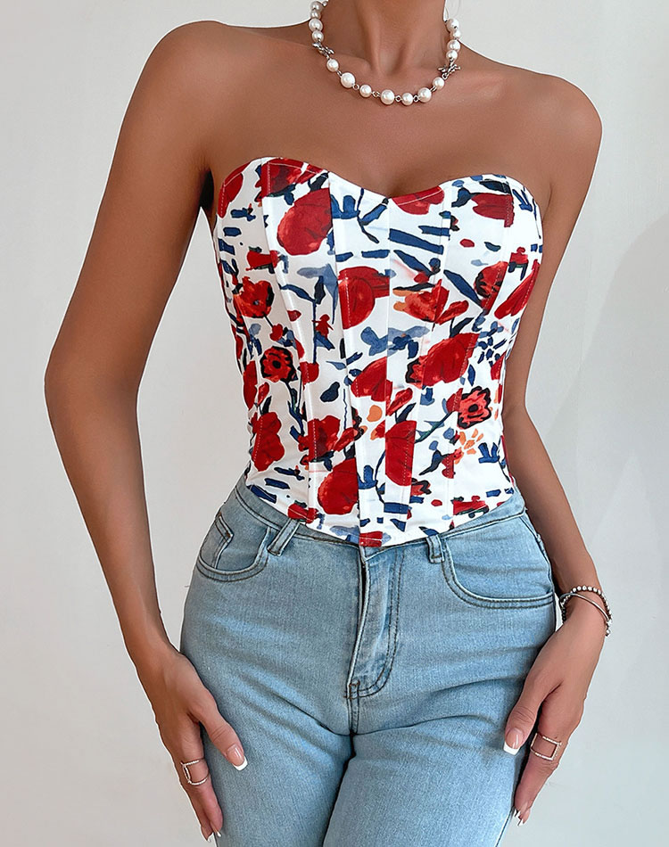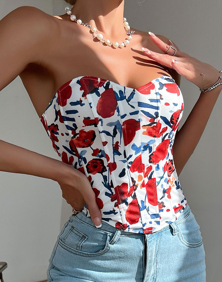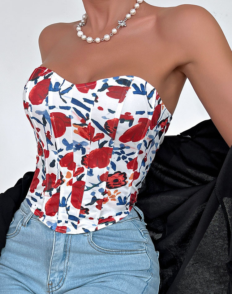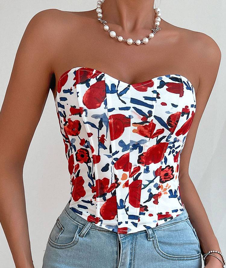 This stylish floral print corset top features a sweetheart neckline and a vibrant pattern of red and blue flowers on a white background. The structured design provides support and shape, making it perfect for both casual outings and special occasions.
