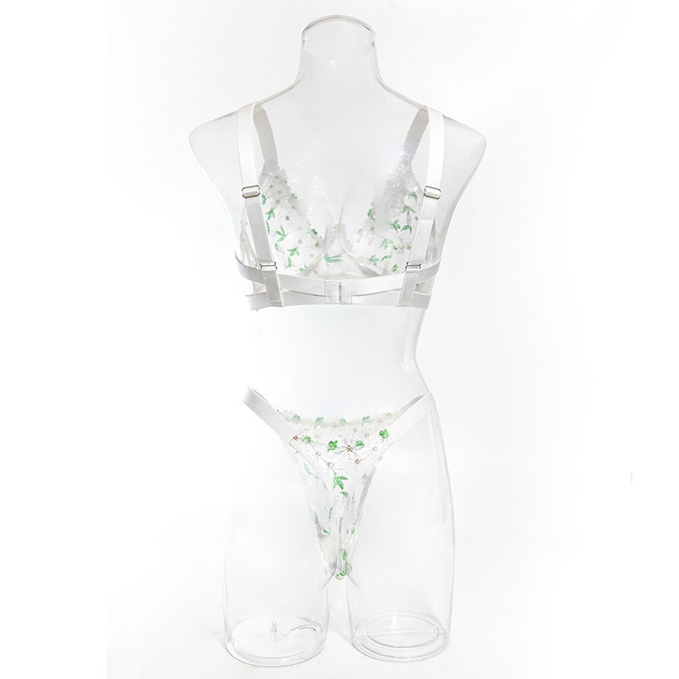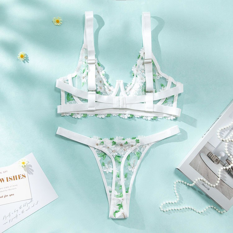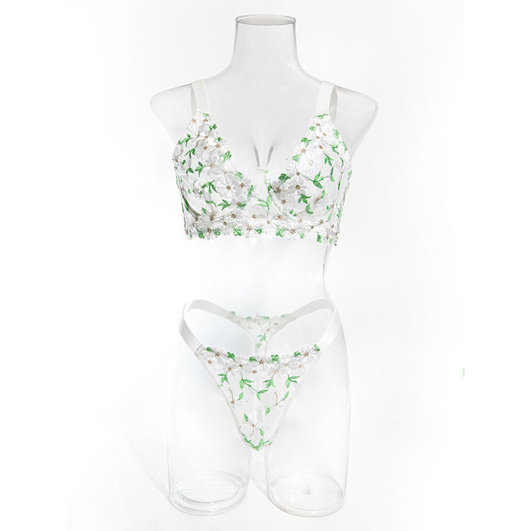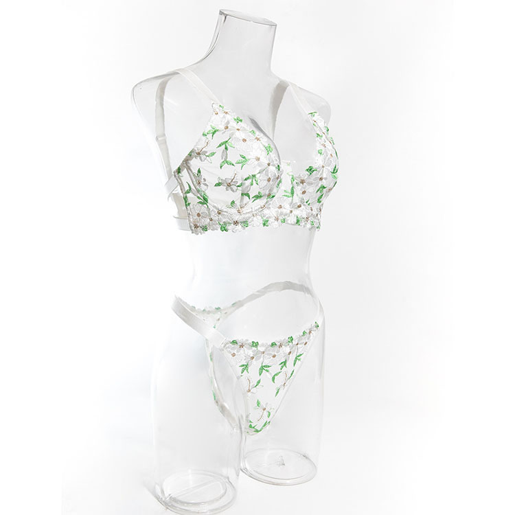 This exquisite lingerie set features a delicate floral embroidery design that adds a touch of romance to your wardrobe. The bra is crafted with sheer fabric and adorned with intricate white flowers and green leaves, providing both support and style. The matching panties offer a comfortable fit with the same charming floral pattern, making this set perfect for those who appreciate beauty in their intimates.