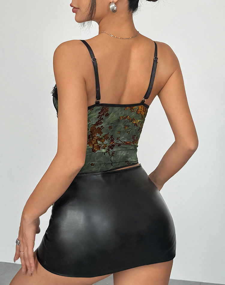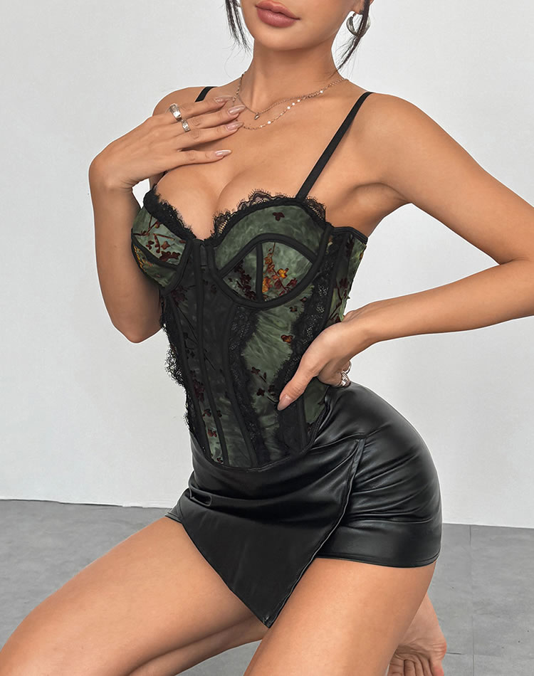 This elegant green corset features intricate floral lace detailing that adds a touch of charm and allure. The combination of soft fabric and delicate design creates a flattering silhouette, while the adjustable lacing ensures a comfortable fit. Perfect for those who want to feel confident and stylish in their lingerie.