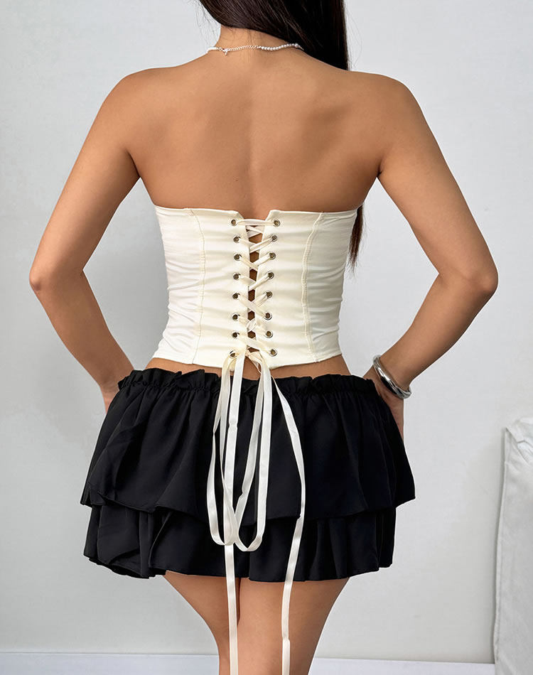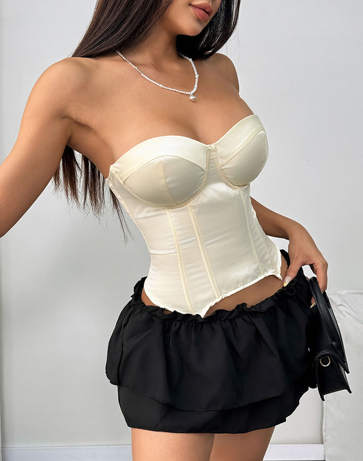 This elegant ivory strapless corset top features a sleek design with supportive cups that ensure both comfort and style. The fitted silhouette accentuates your curves, making it perfect for pairing with high-waisted skirts or pants. Ideal for those who want to feel confident and chic in their everyday wear.