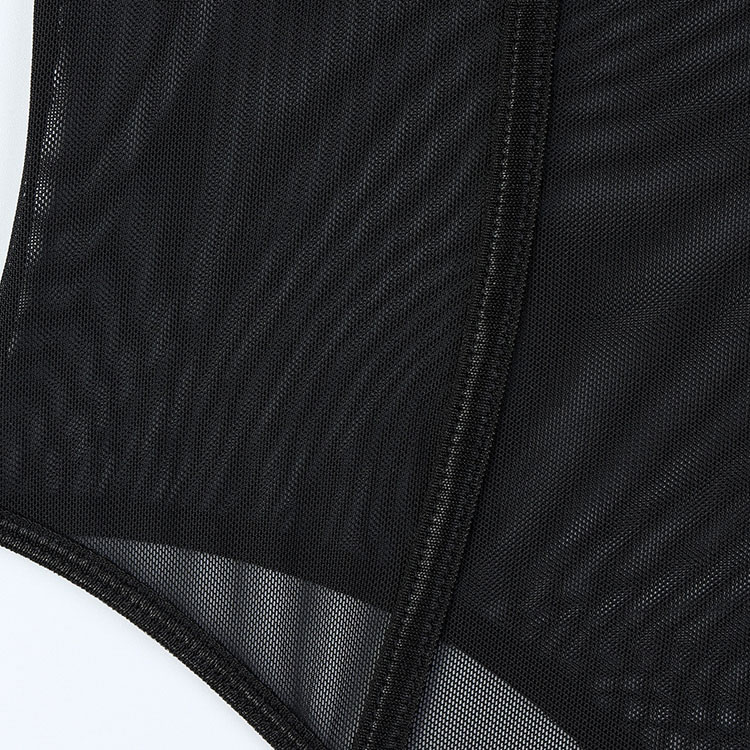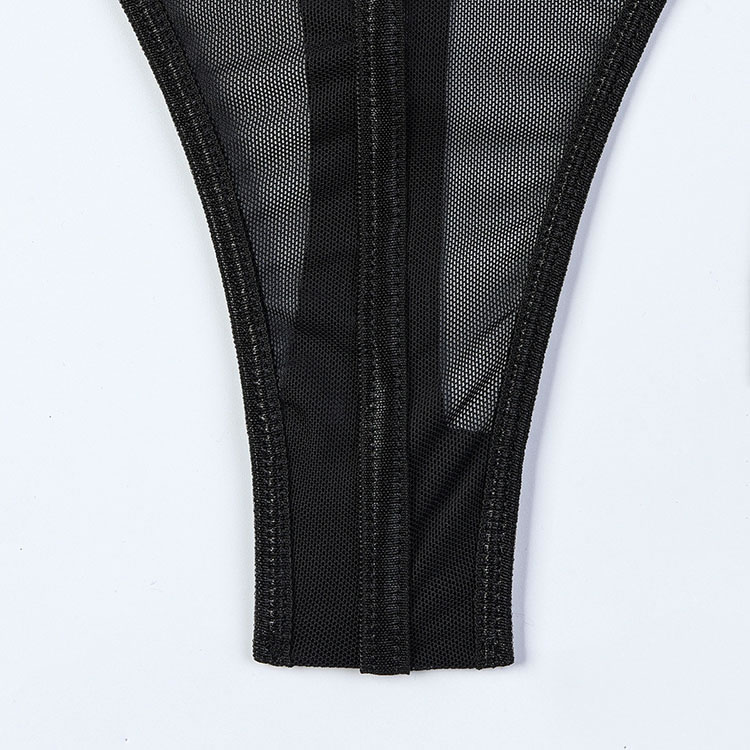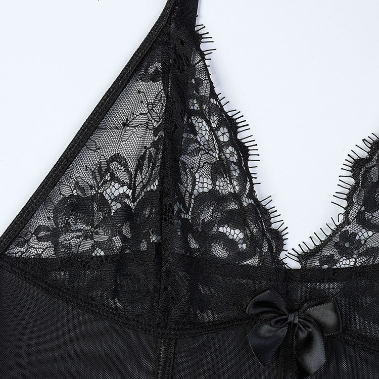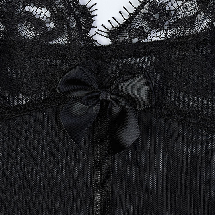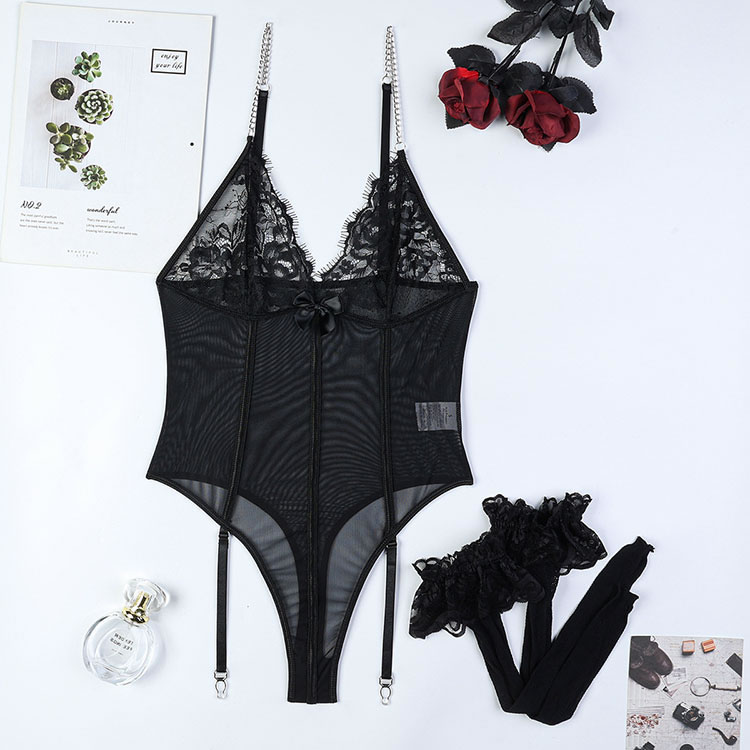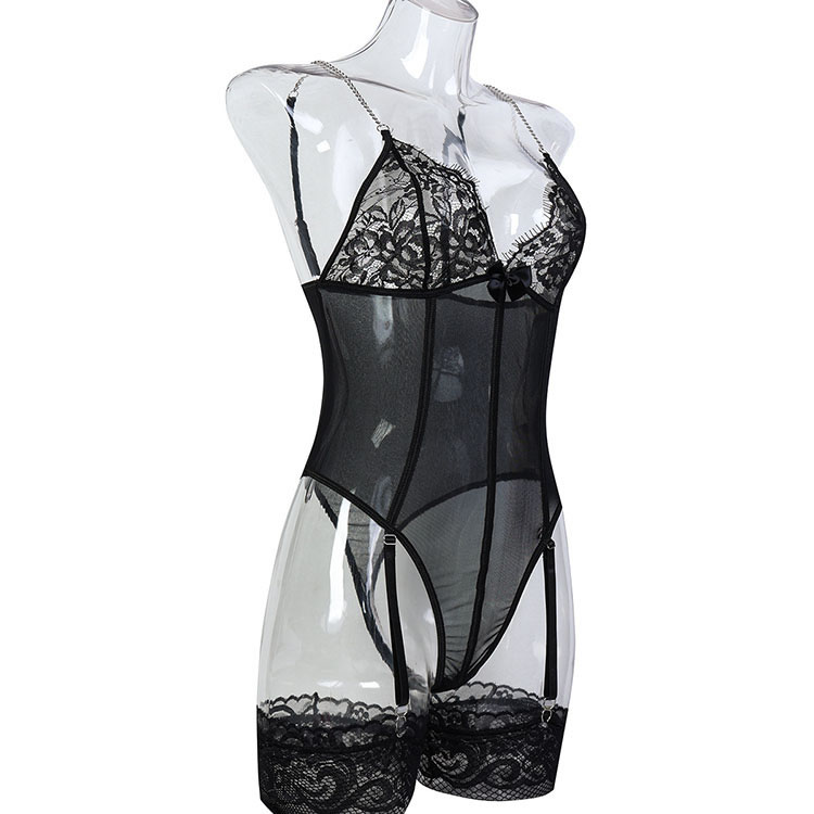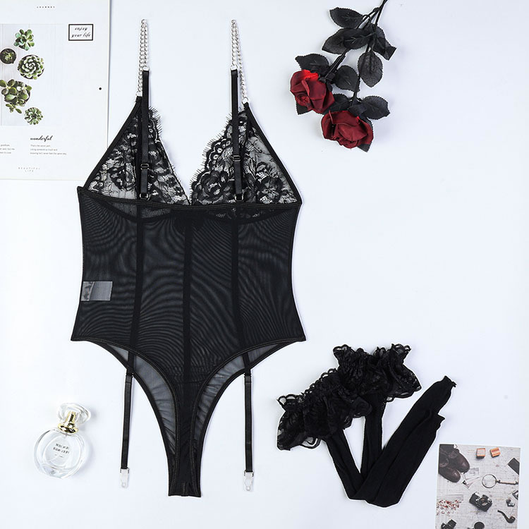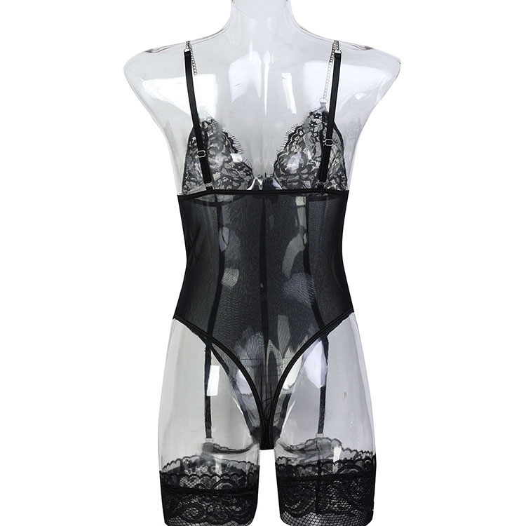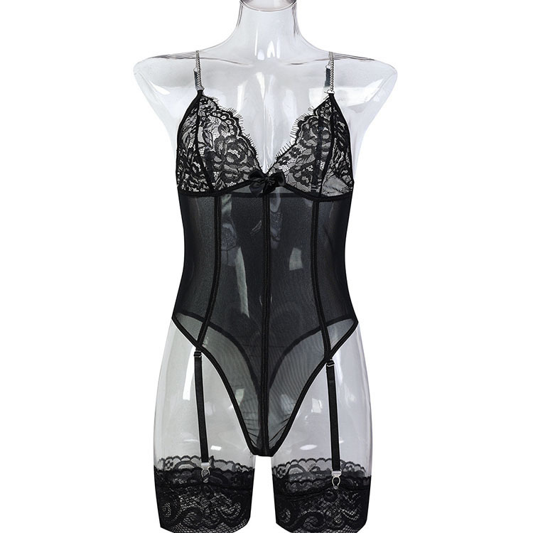 This seductive lingerie set features a black lace and mesh bodysuit with intricate lace detailing on the cups and a sheer mesh center panel. The garter straps add a playful touch, making it perfect for a night of allure.