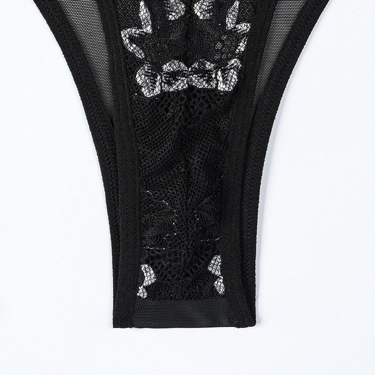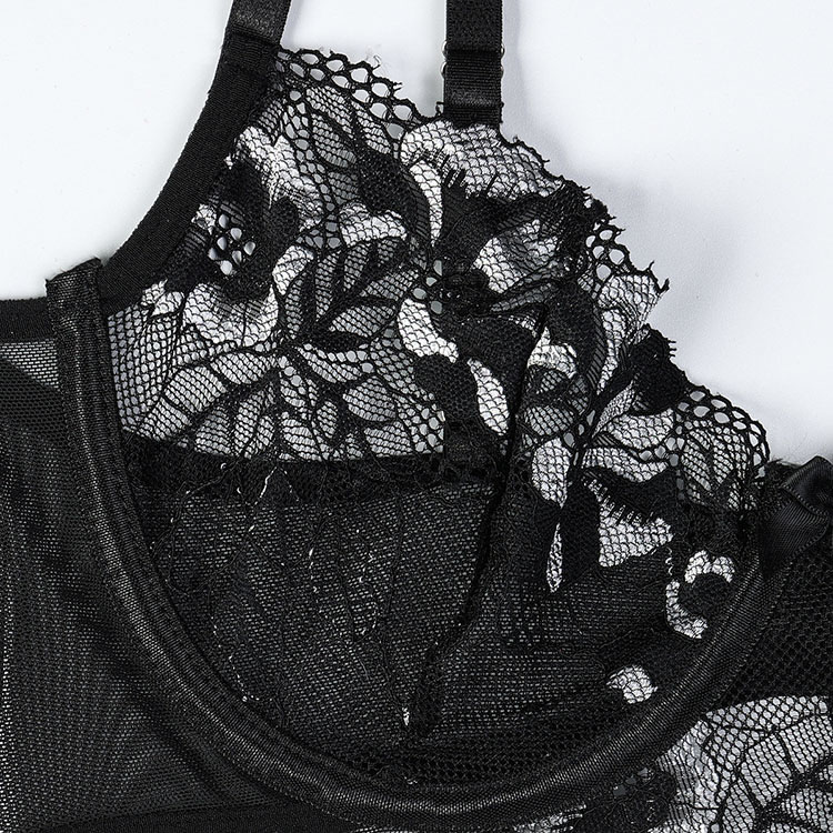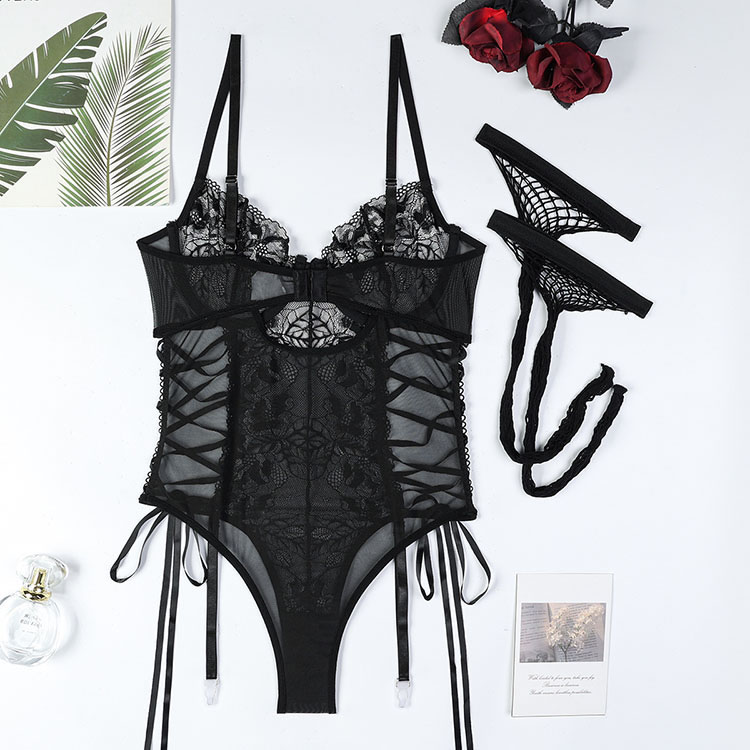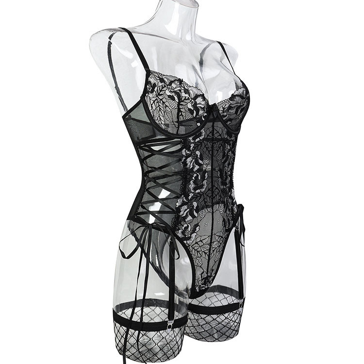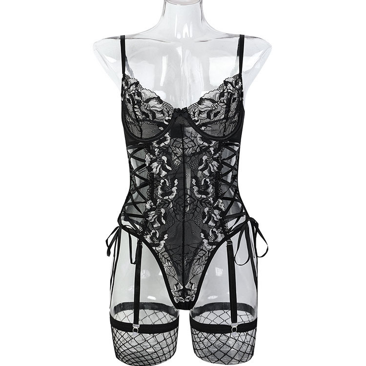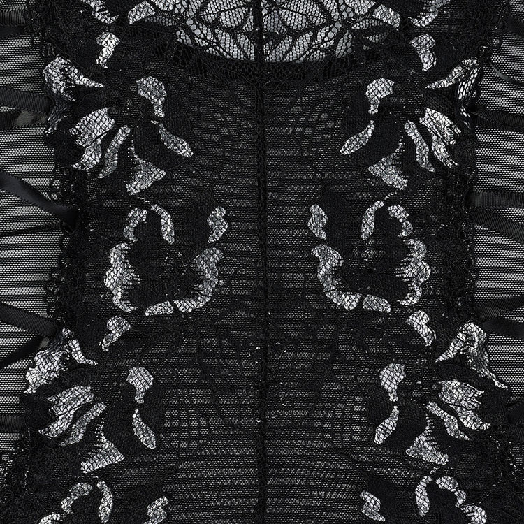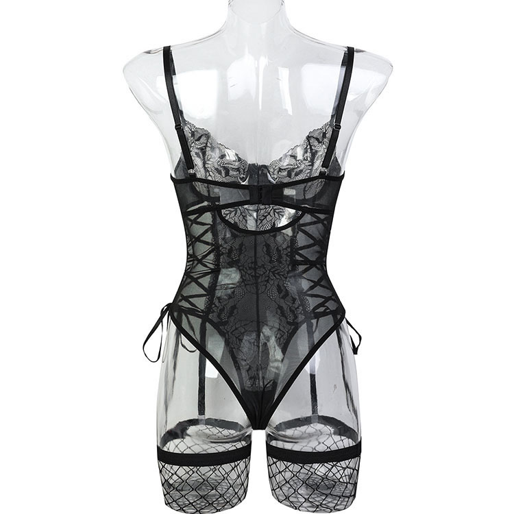Elevate your lingerie collection with this elegant lace bodysuit. The combination of black lace and sheer mesh provides a sophisticated yet daring look, enhanced by the lace-up front for added appeal.