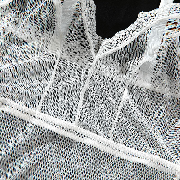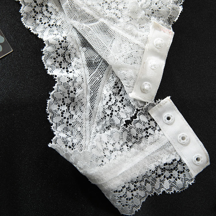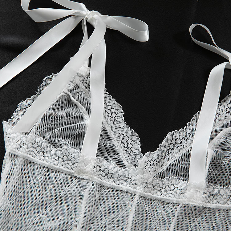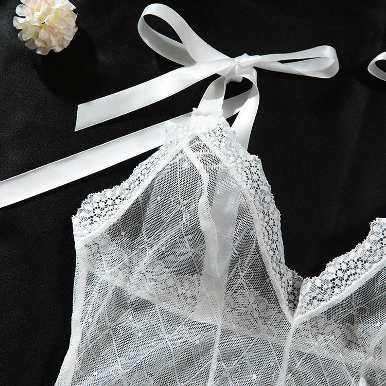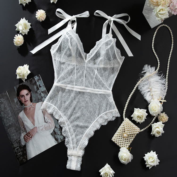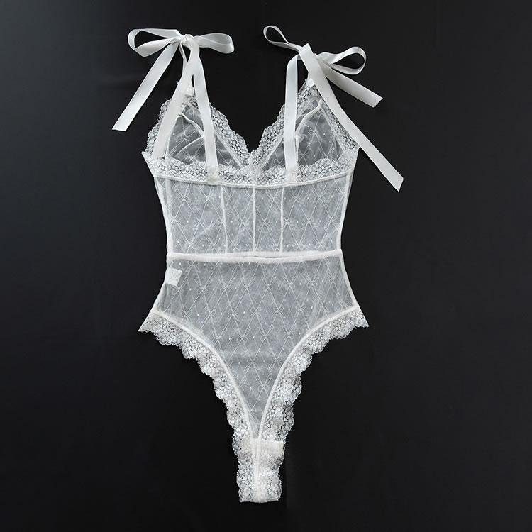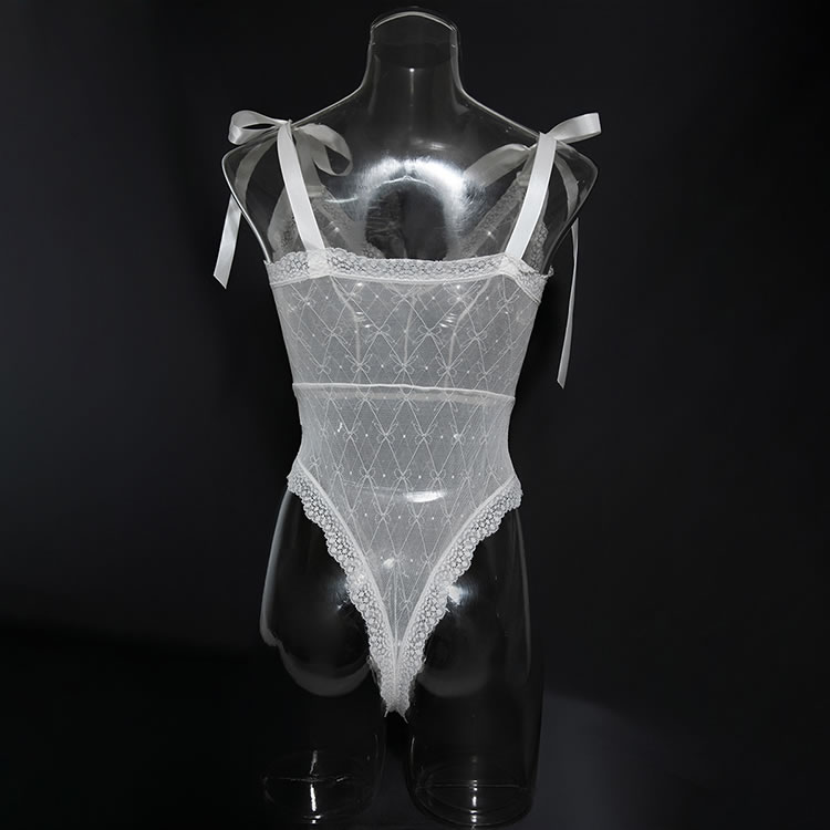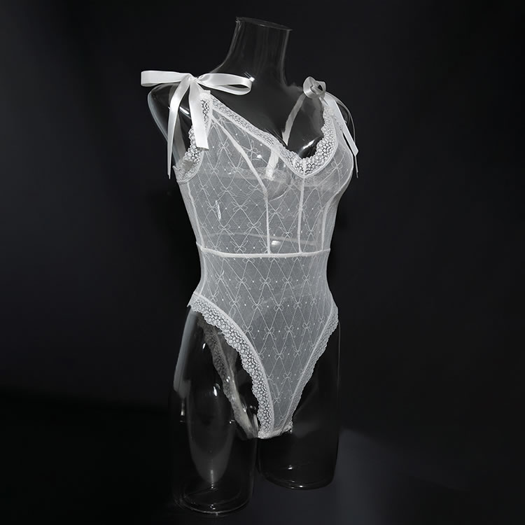 Introducing the Elegant Lace Bodysuit with Sheer Delights, a must-have for every woman's wardrobe. Crafted from the sheer mesh fabric, this bodysuit features exquisite white lace trim that accentuates every curve. The adjustable shoulder straps adorned with cute bows offer a touch of playfulness and comfort. Perfect for a romantic evening or a special occasion, this bodysuit will make you feel confident and alluring from head to toe.