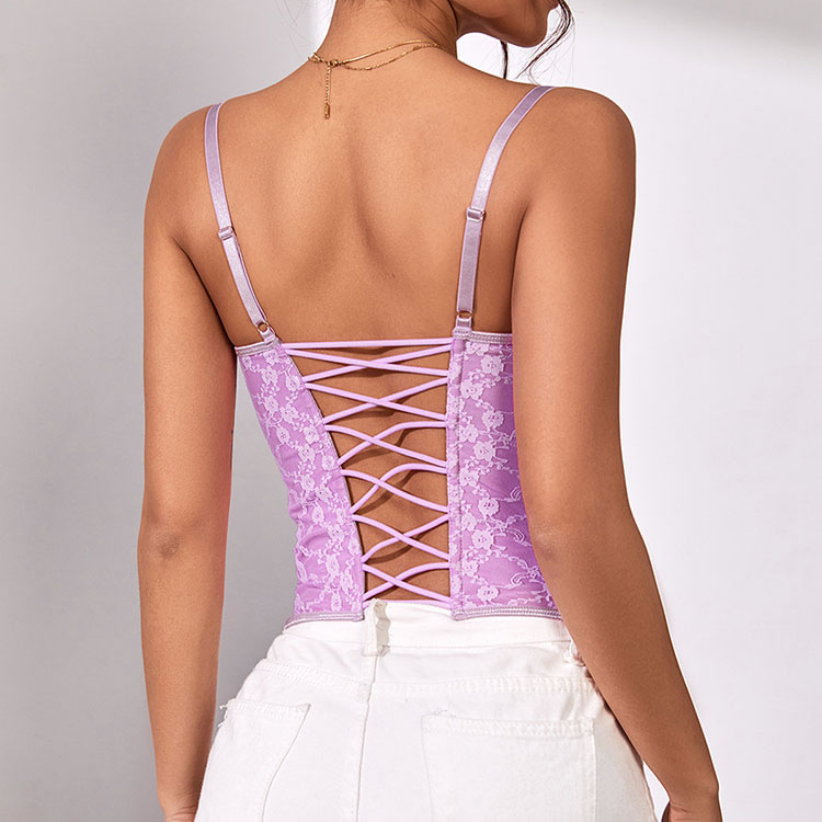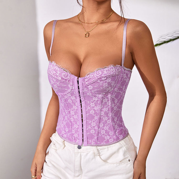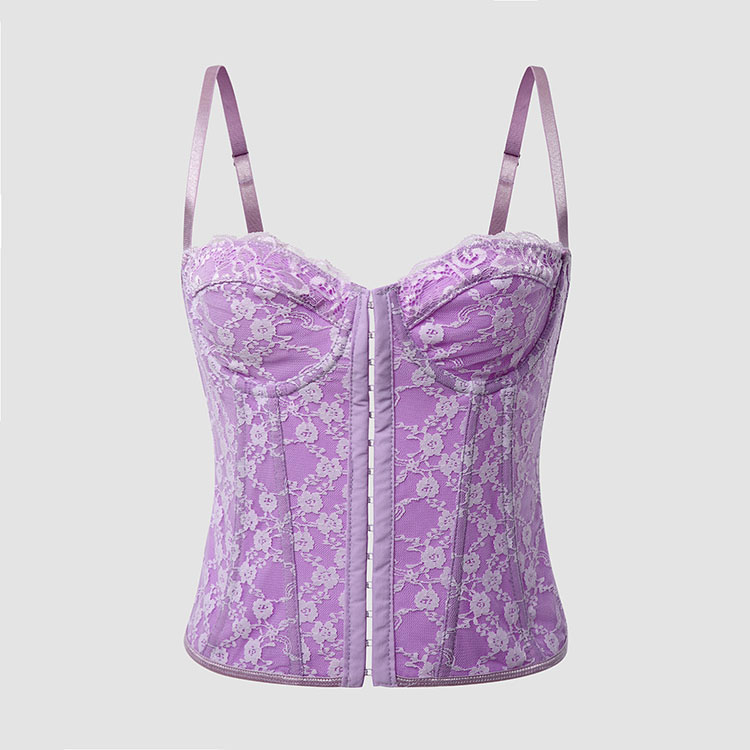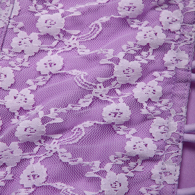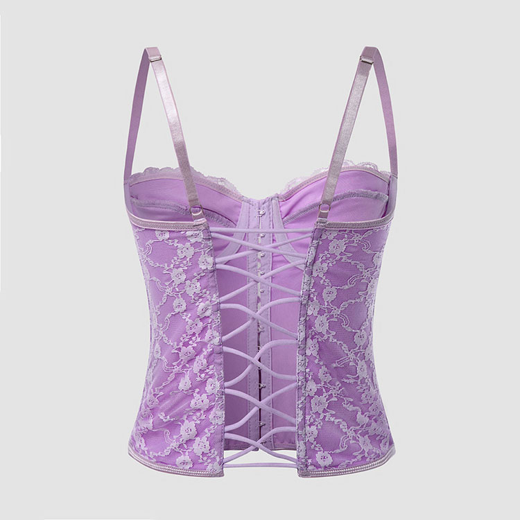 This elegant corset top features a sweetheart neckline with intricate lace detailing in a soft lilac hue. The structured fit provides support and shape, making it perfect for both formal events and stylish outings.