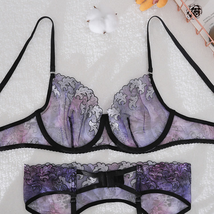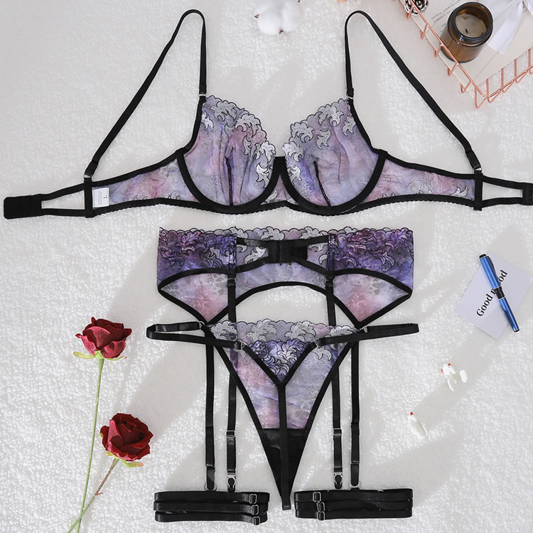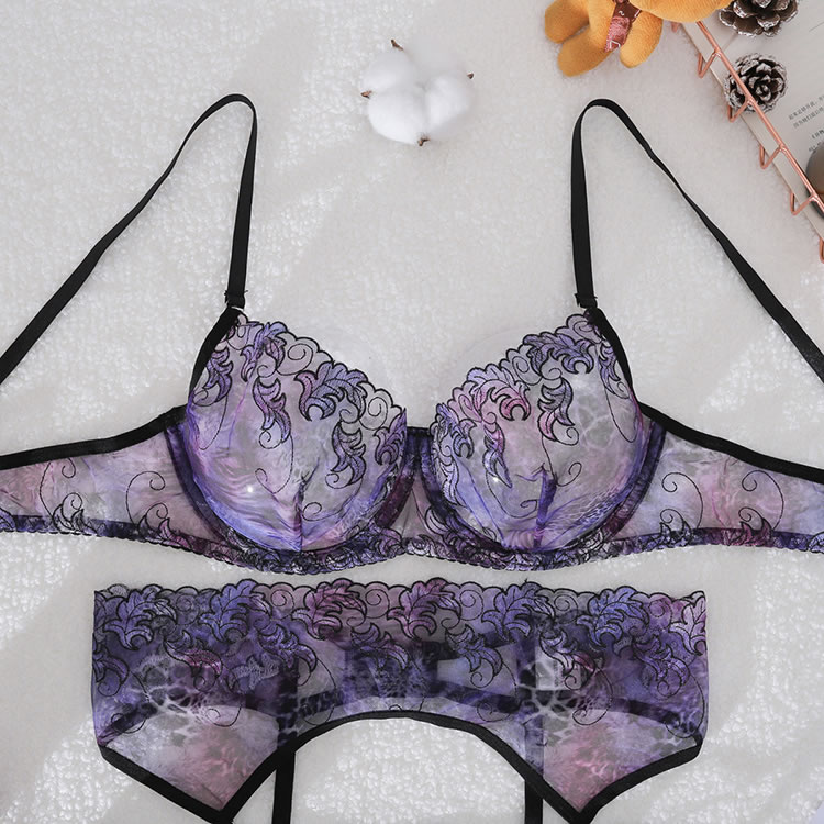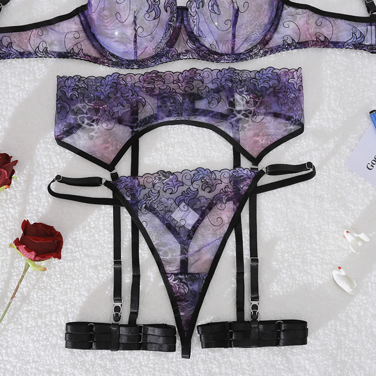 This elegant purple floral lingerie set is a perfect choice for those who appreciate intricate designs and a touch of allure. The bra features detailed floral patterns that enhance its charm, while the matching panties offer a flattering fit. The garters add a playful touch, making it an ideal ensemble for anyone seeking both style and confidence in their intimates.