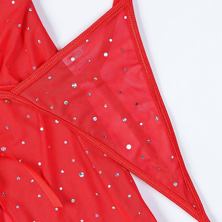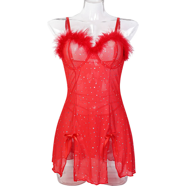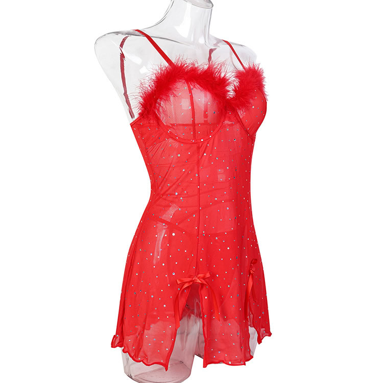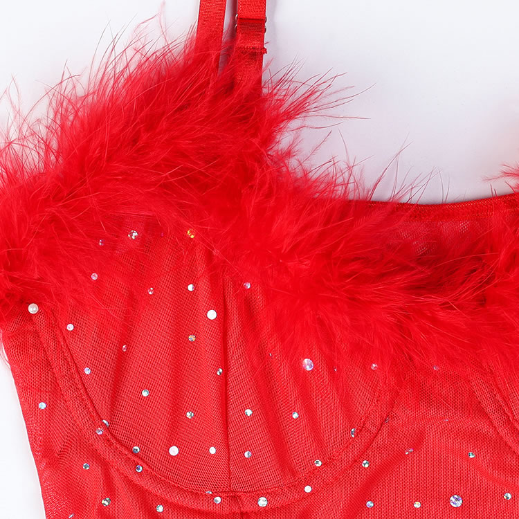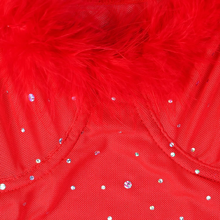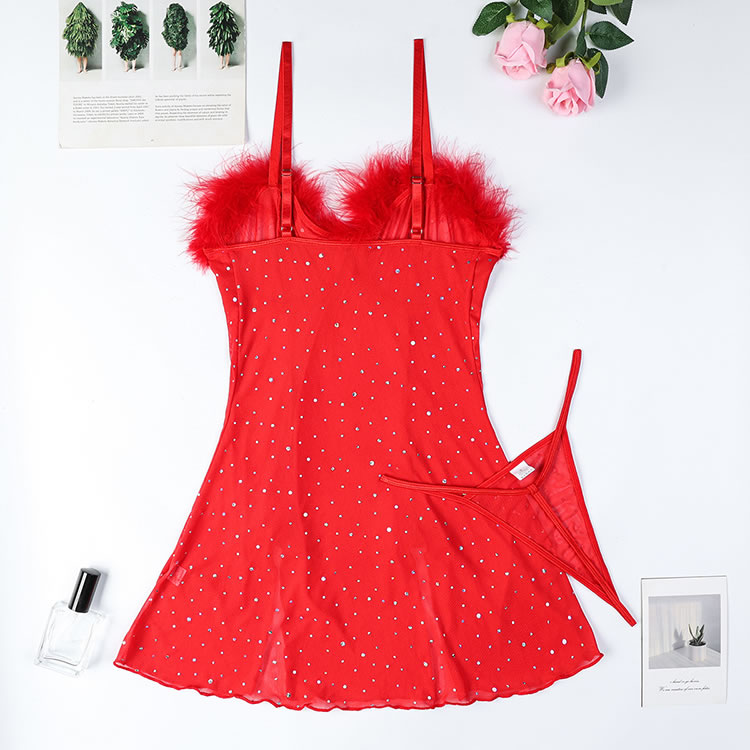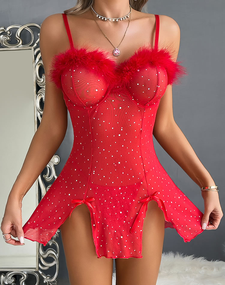 This stunning lingerie set is a perfect blend of allure and elegance. The bralette features a sheer mesh fabric adorned with sparkling rhinestones, creating a dazzling effect. The plush feather trim at the neckline adds a luxurious touch, while the adjustable spaghetti straps ensure a comfortable fit. The matching panties are crafted from the same sheer mesh. This set is ideal for those who want to feel both glamorous and confident.
