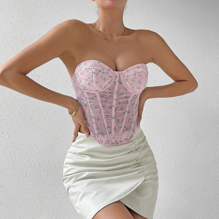 Elevate your style with this romantic pink floral lace bustier. The sweetheart neckline and intricate lace detailing create a delicate and feminine look. The structured design ensures a flattering fit that enhances your curves, while the strapless design allows for versatile styling options. Perfect for special occasions or adding a touch of elegance to any outfit.