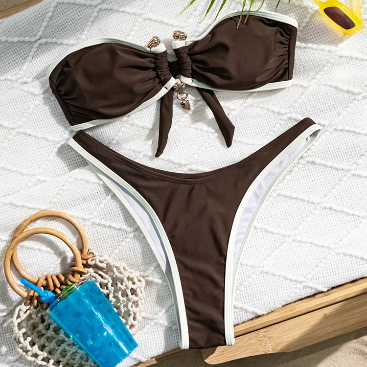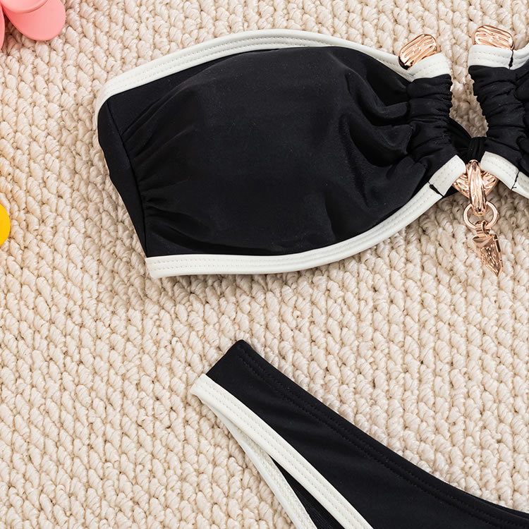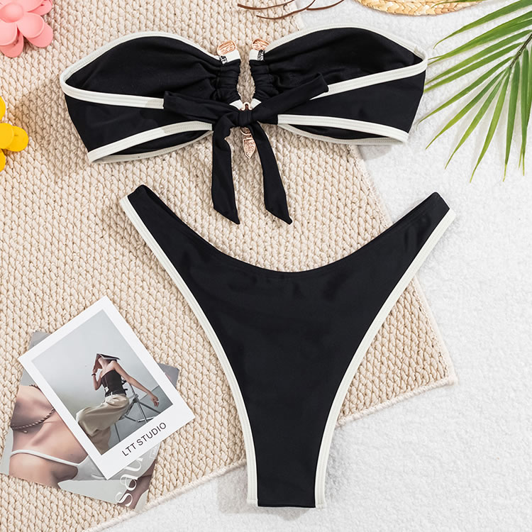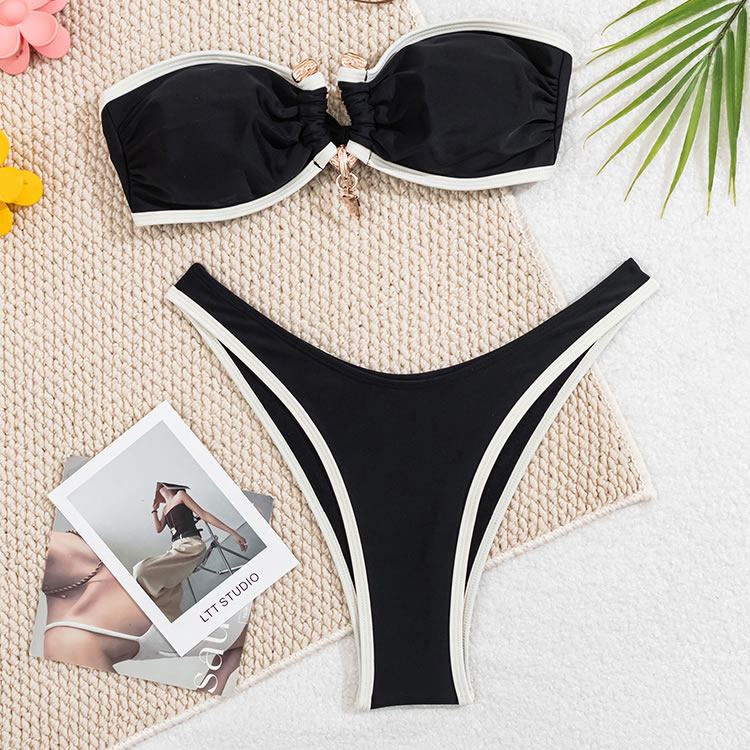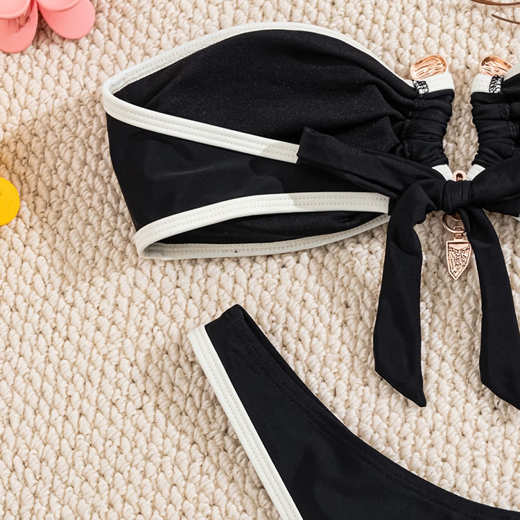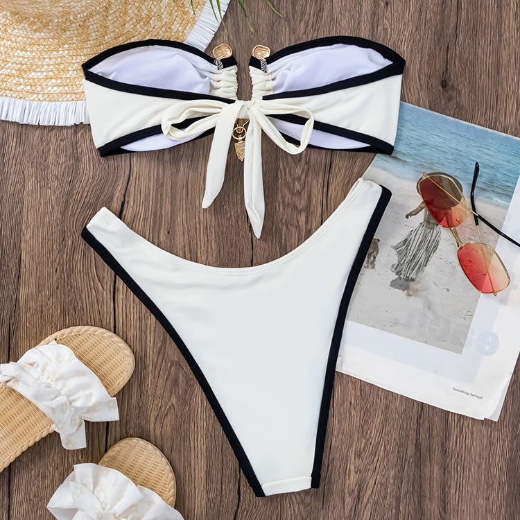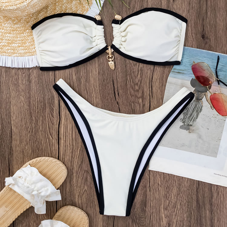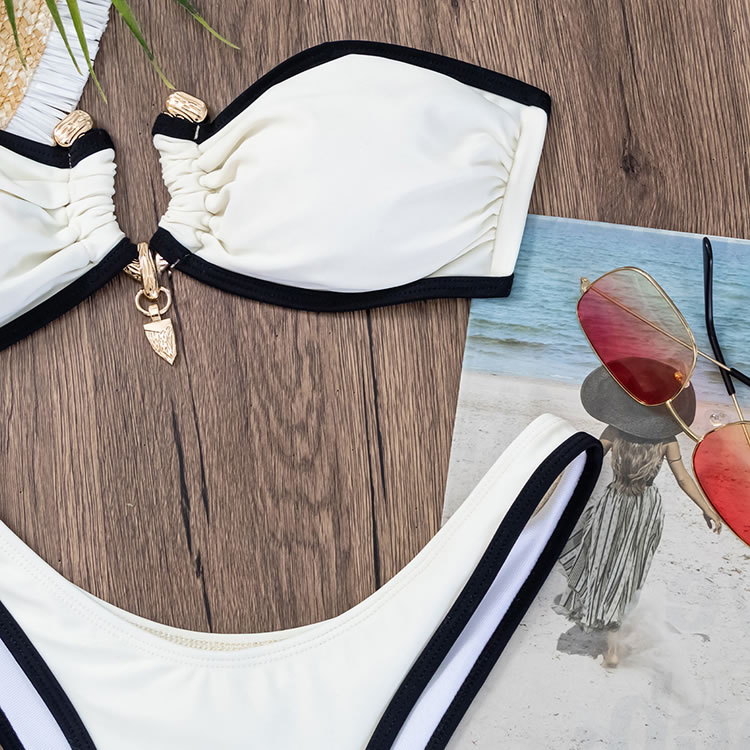 Radiate elegance in this white bandeau bikini featuring black trim. The ruched design on the top adds a touch of sophistication, while the matching bottoms ensure a flattering fit. This bikini is perfect for those who want to feel both stylish and confident by the pool or beach.