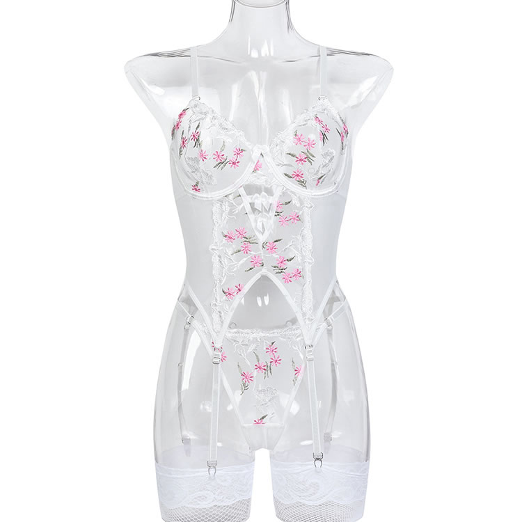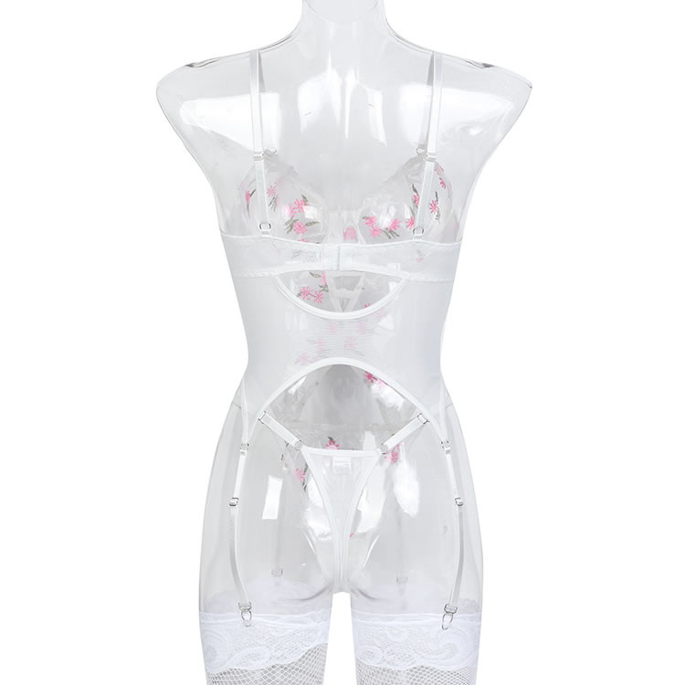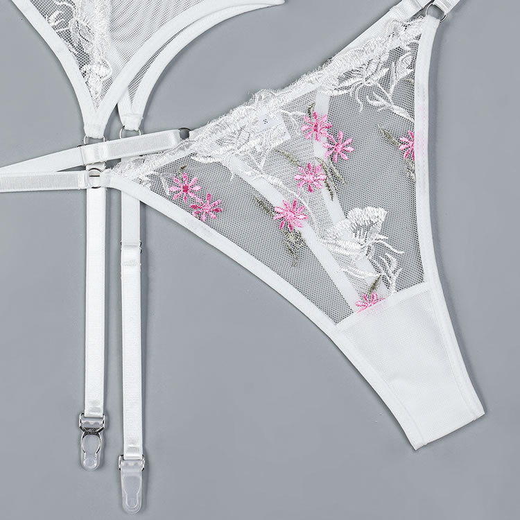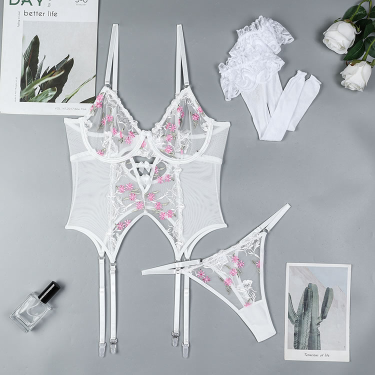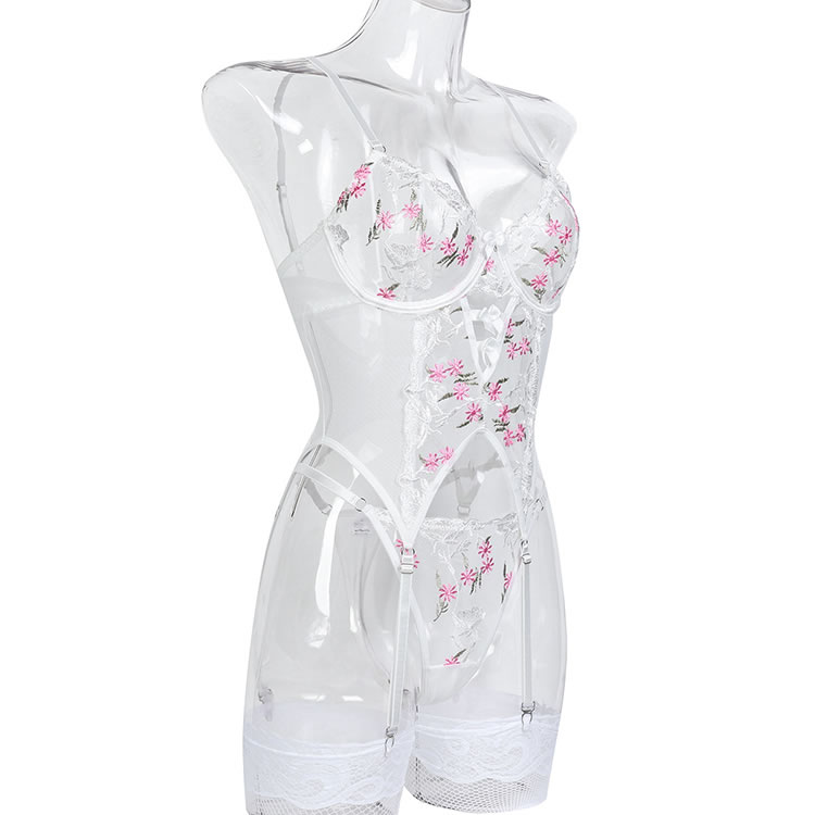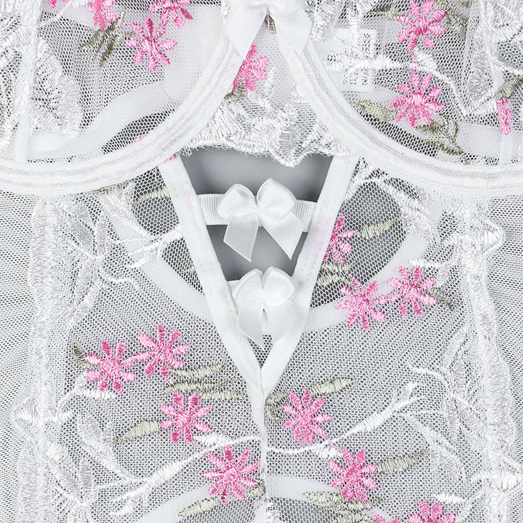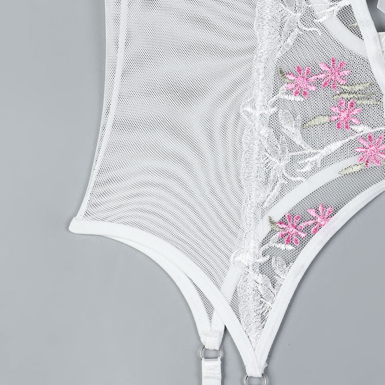 This elegant white sheer chemises features delicate pink floral embroidery that adds a touch of romance and charm. The adjustable straps and garters ensure a comfortable fit, while the open design highlights your natural curves. Perfect for those who want to feel confident and stylish in their lingerie.