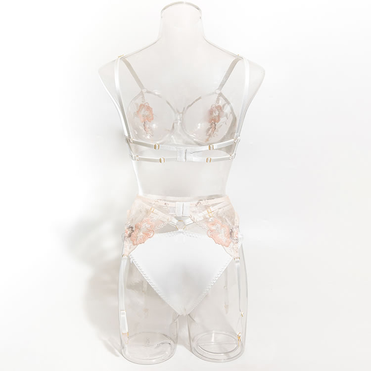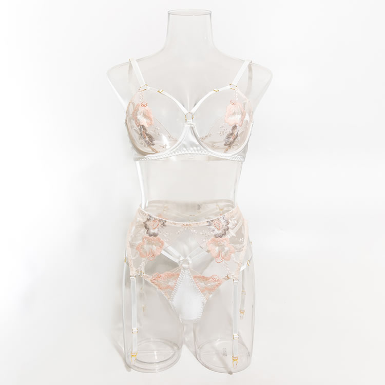 Unleash your inner seductress with this sensual mesh bra set, featuring sheer mesh underwire cups with enticing strappy bust detailing. Adjustable spaghetti straps and a hook-and-eye back closure ensure a perfect fit, while the matching high-waisted garter belt adds a bold touch. Complete with adjustable garter straps and a cheeky panty, this set is designed to make you blossom into the ultimate sex kitten.