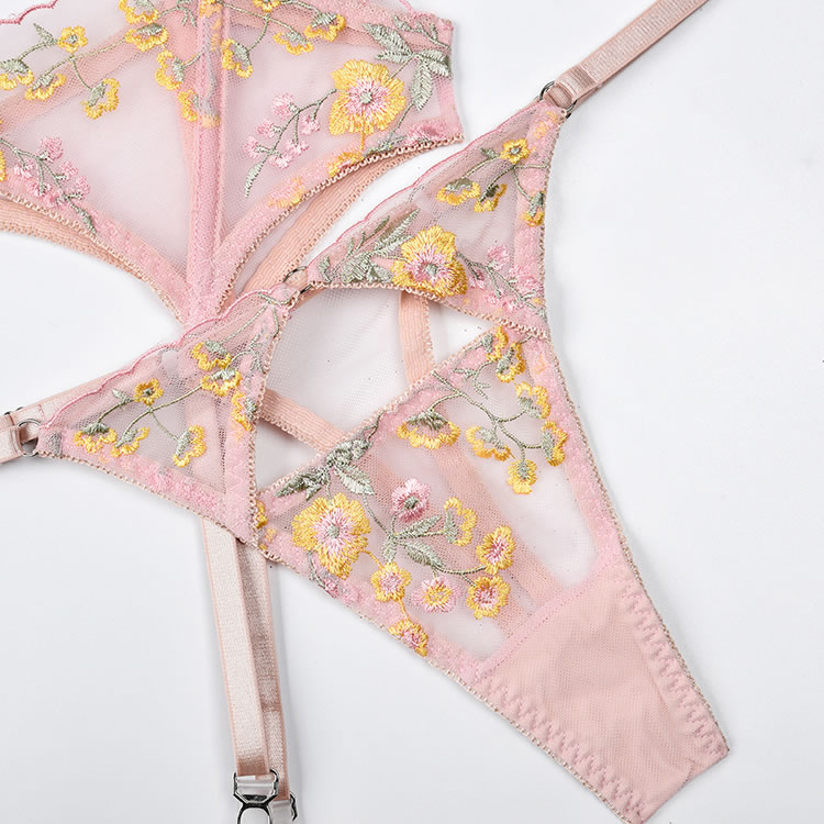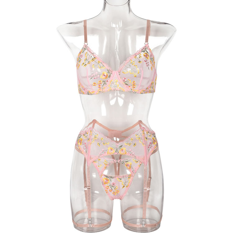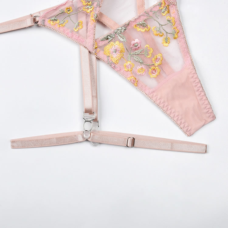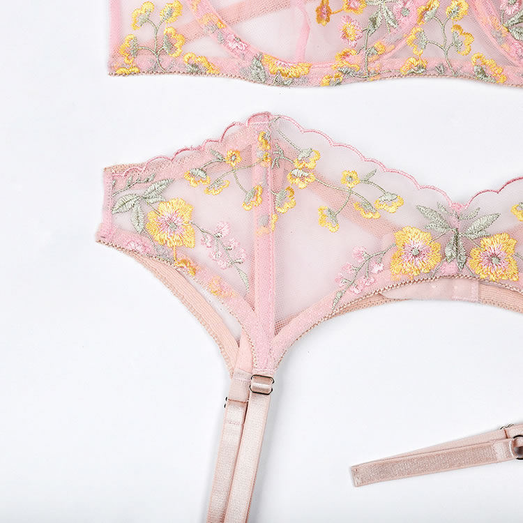 Embrace femininity and elegance with this stunning pastel pink lingerie set, adorned with intricate floral embroidery that radiates charm and grace. The sheer bra features underwired cups for a natural lift and support, while the matching high-waist garter belt accentuates your curves with sophistication.
