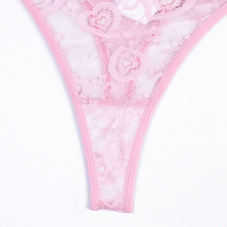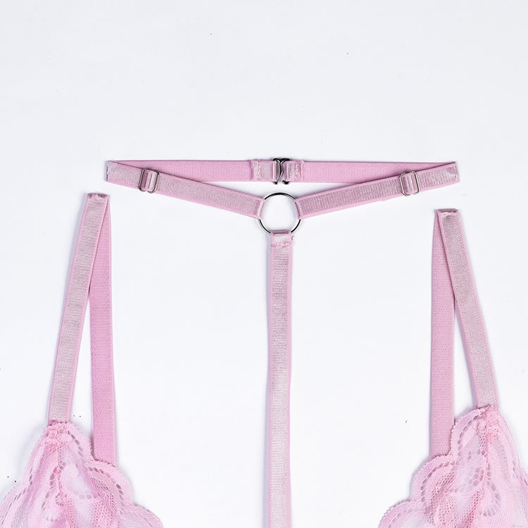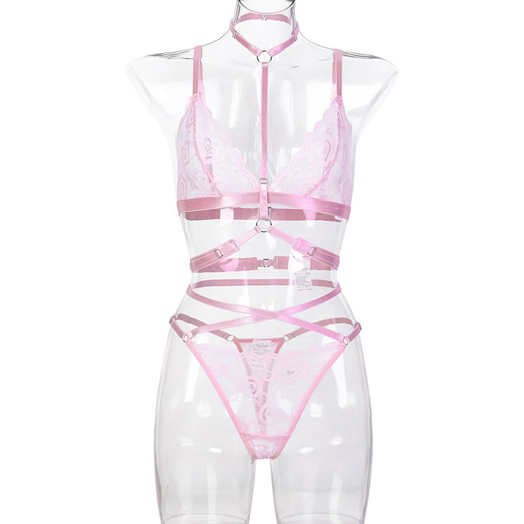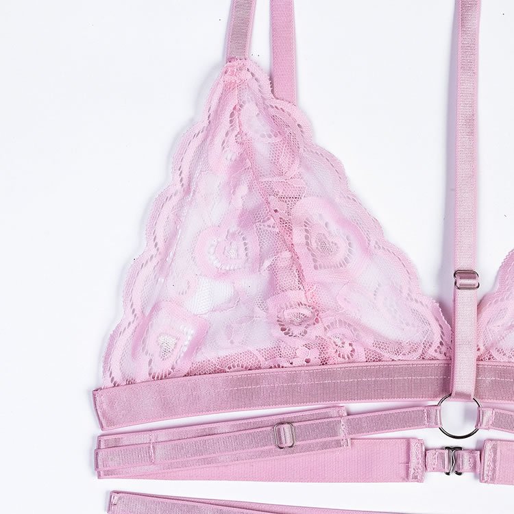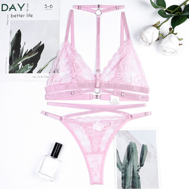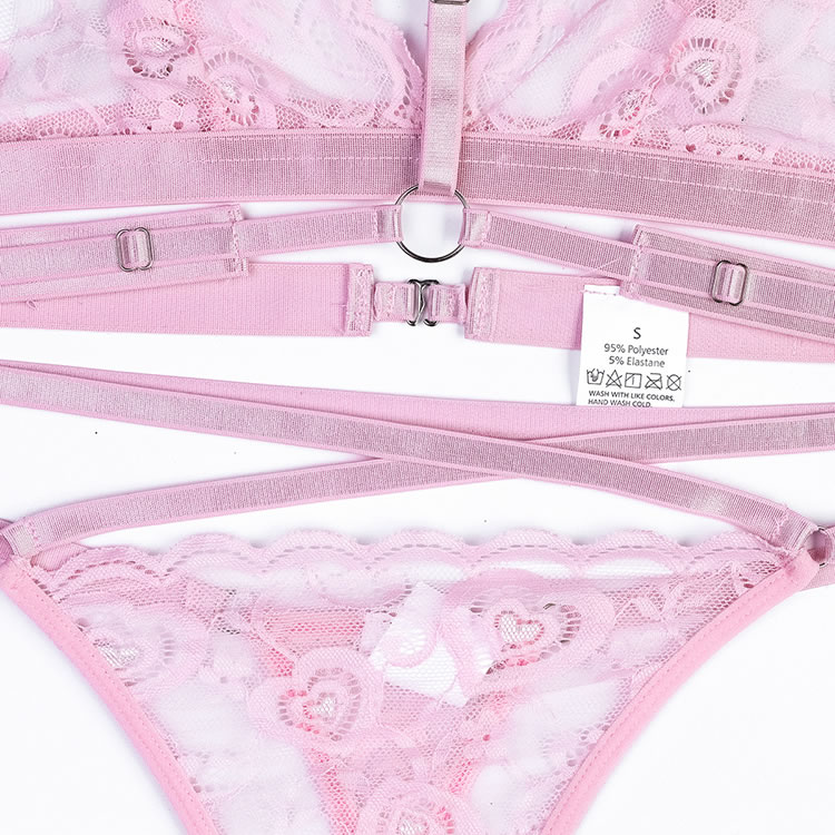 Leave the lights on in this sexy bra set featuring sheer, embroidered heart lace triangle cups, adjustable spaghetti straps, an elastic underbust band with a hook back closure, a harness with an adjustable bodice strap, a choker neck, a back hook closure, and a matching thong.