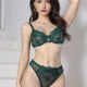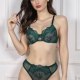 This elegant green lingerie set features a delicate lace design with intricate floral patterns that add a touch of romance to its silhouette. The bralette is crafted with sheer mesh panels, offering both comfort and shape. Thin adjustable straps and a classic scalloped edge enhance the feminine appeal, while the matching high-cut briefs feature a wide lace trim and a transparent center panel for a bold look. Designed to flatter the figure, this two-piece set blends vintage charm with modern sensuality.