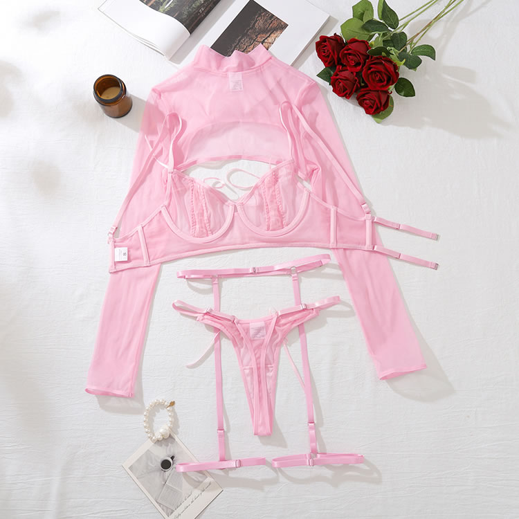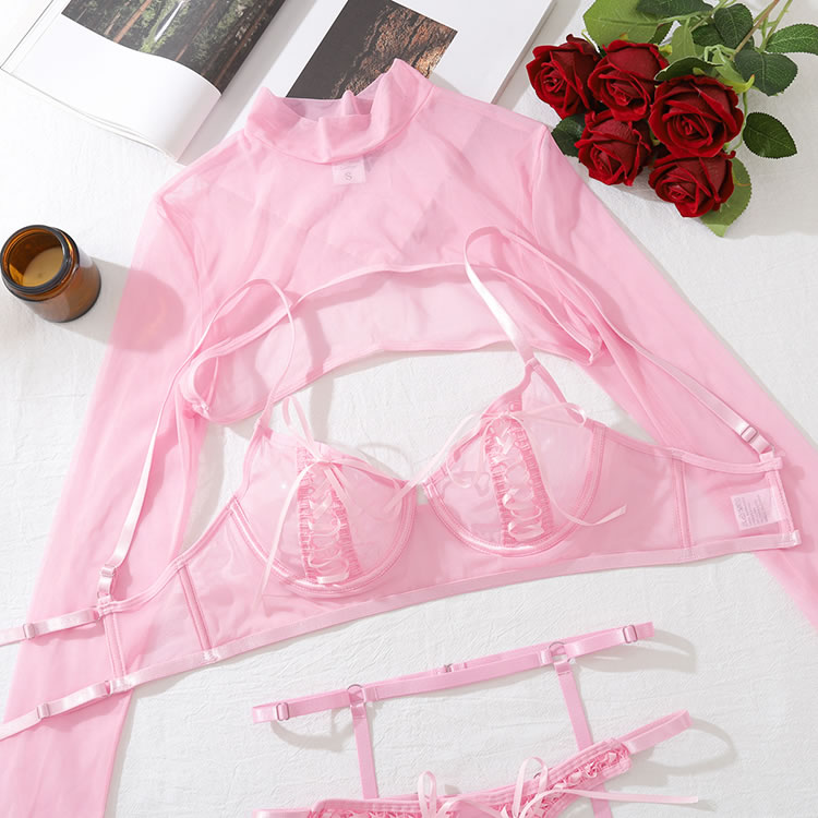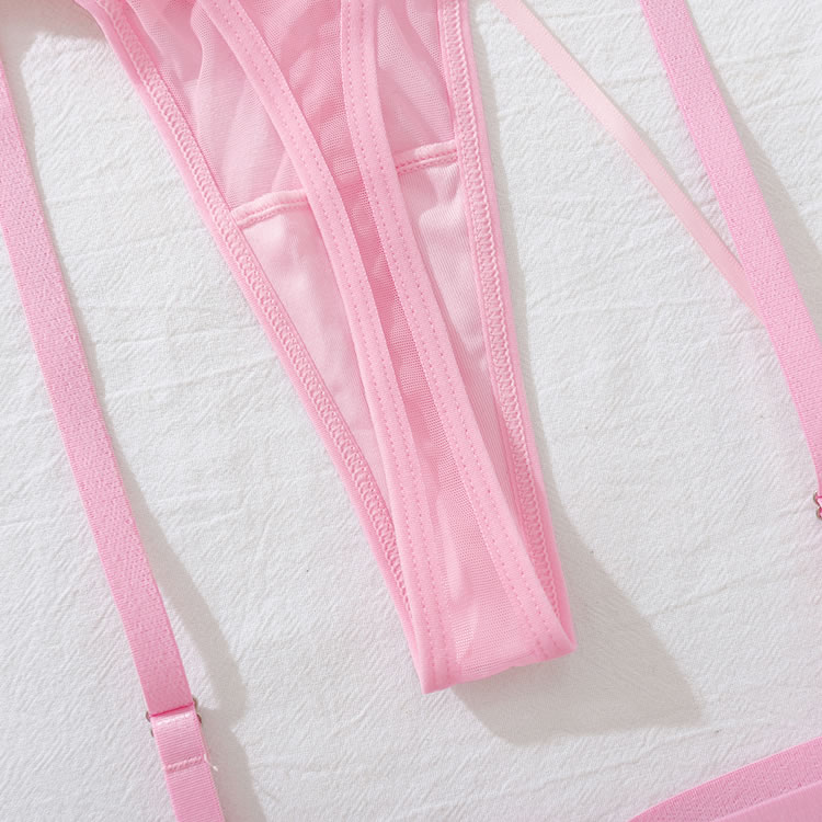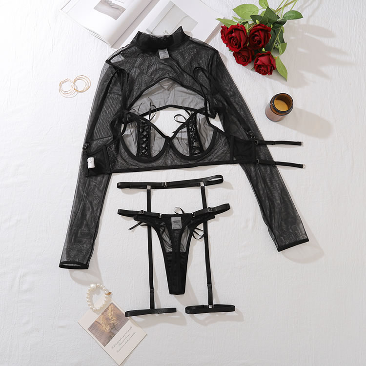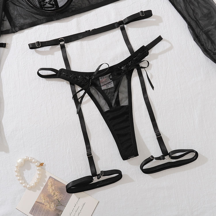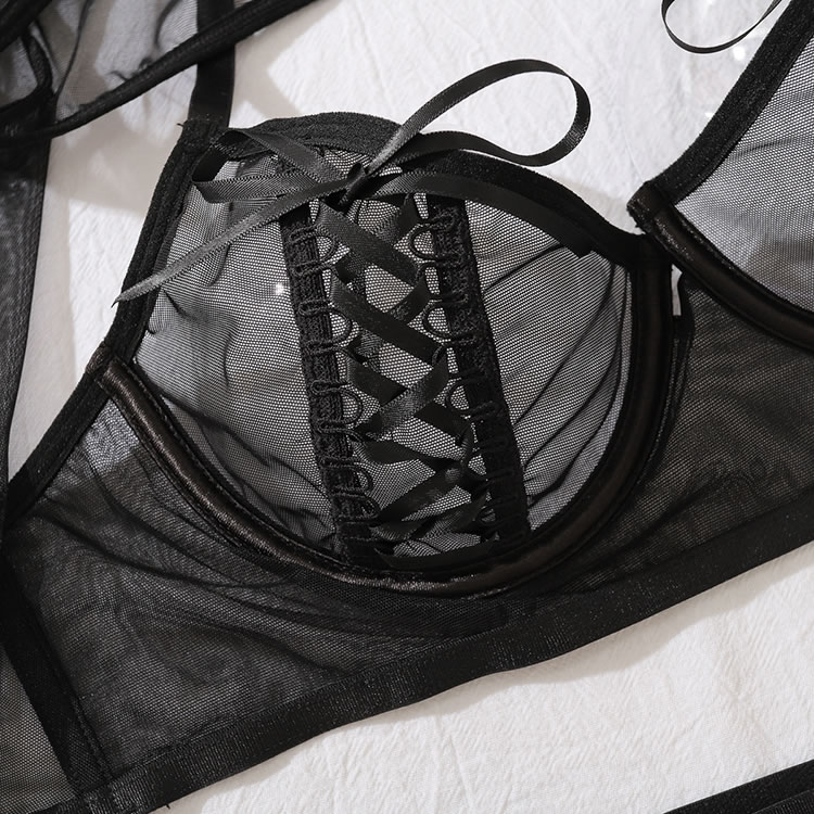 Enhance your lingerie wardrobe with this stunning bra set, featuring sheer mesh underwire cups with alluring lace-up details and adjustable spaghetti straps. The set includes a high-waisted garter belt with adjustable straps, wraparound leg garters, and a matching thong panty. Complete the look with a chic crop top for a sultry yet sophisticated ensemble that exudes confidence and style.