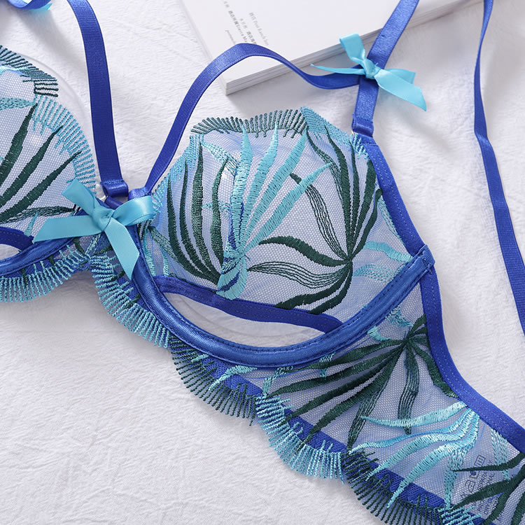 Ignite your nights with this alluring bra set, designed to captivate. It features sheer mesh underwire cups with strappy detailing, adjustable spaghetti straps, and a hook and eye back closure. Complete with a matching thong panty, this set adds a seductive touch to your late-night adventures.