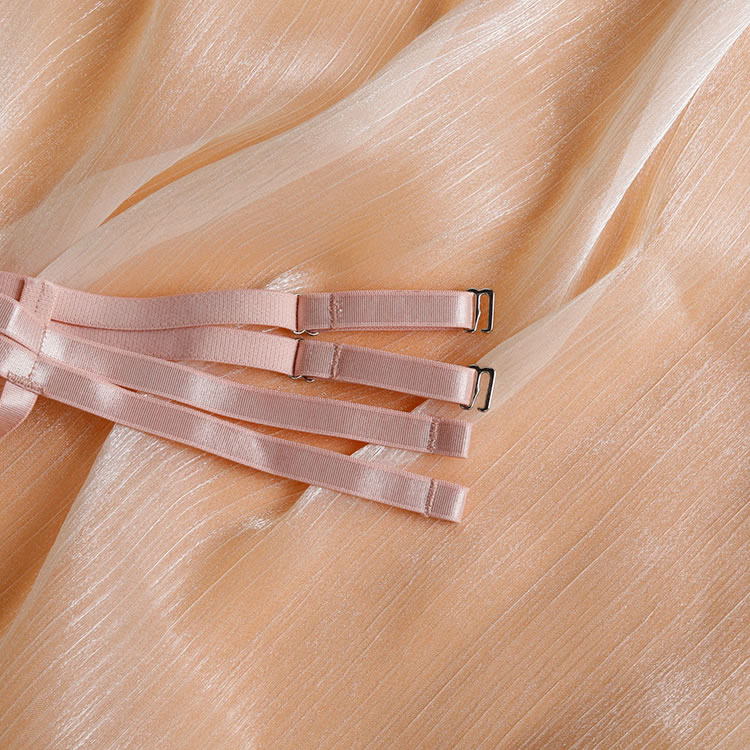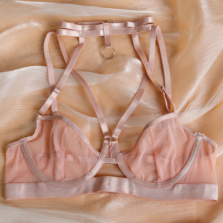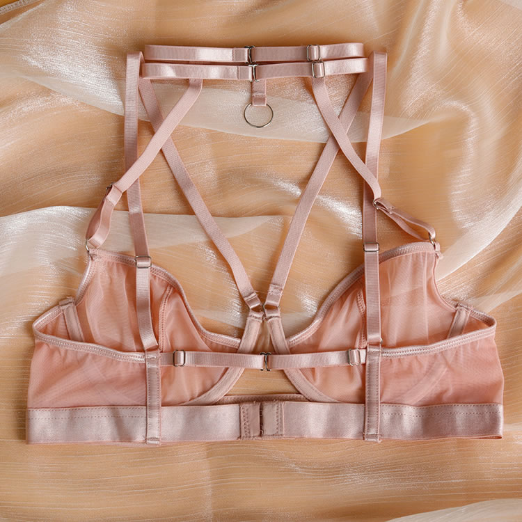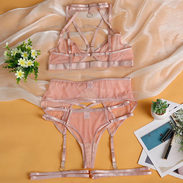 Turn heads and captivate in this irresistible bra set. Featuring sheer mesh underwire cups with sultry strappy bust detailing and a high choker neckline, this set exudes bold sensuality. Adjustable spaghetti straps and a hook and eye back closure ensure a perfect fit, while the high-waisted garter belt with adjustable straps and wraparound leg garters add a daring touch. Paired with a cheeky cut panty, this seductive ensemble guarantees all eyes will be on you.