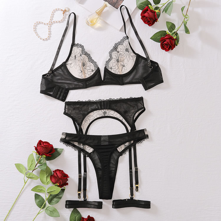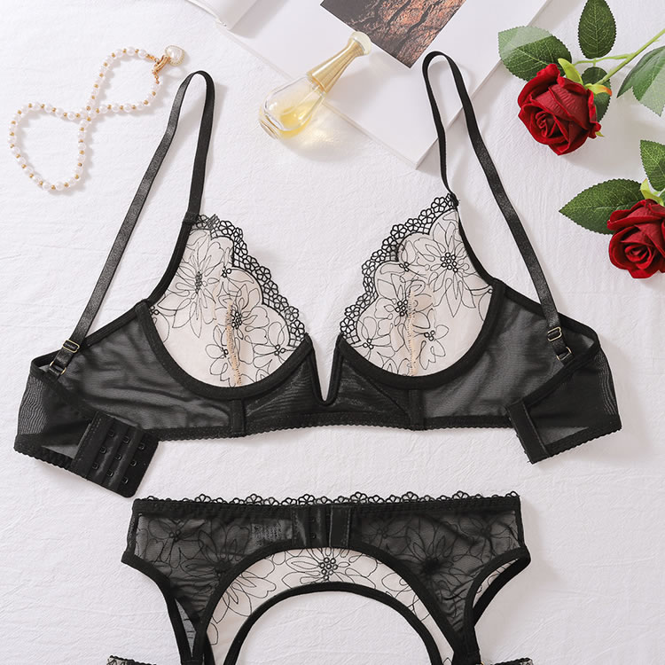 Seduce your lover in this alluring bra set, featuring sheer mesh underwire cups with intricate floral embroidery, adjustable spaghetti straps, and a hook and eye back closure. Complete the look with a matching high-waisted garter belt with adjustable garter straps, wraparound leg garters, and a matching thong panty for an unforgettable evening.