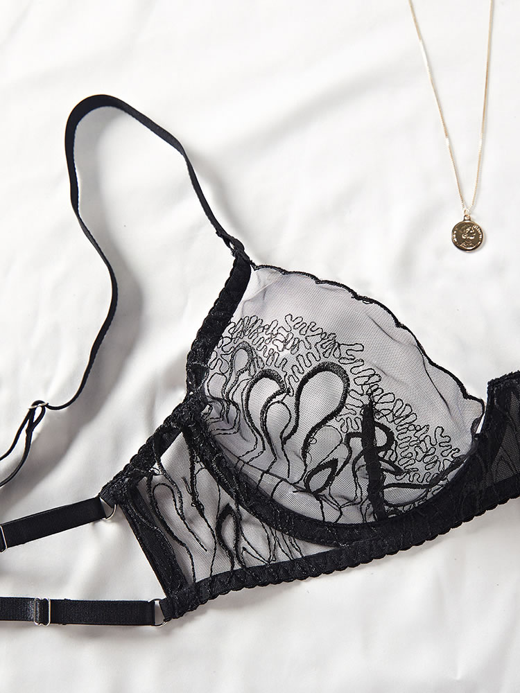 Turn up the heat in this romantic lace bra set featuring sheer underwire cups, adjustable spaghetti straps, a hook and eye back closure, a matching high waisted garter belt with adjustable garter straps, and a matching thong panty.