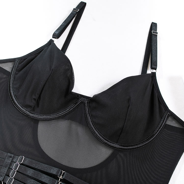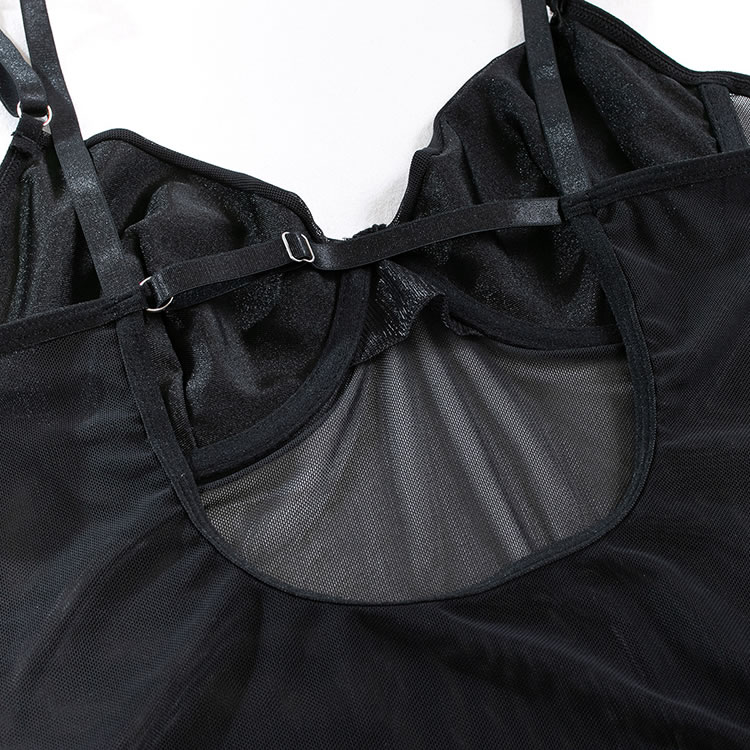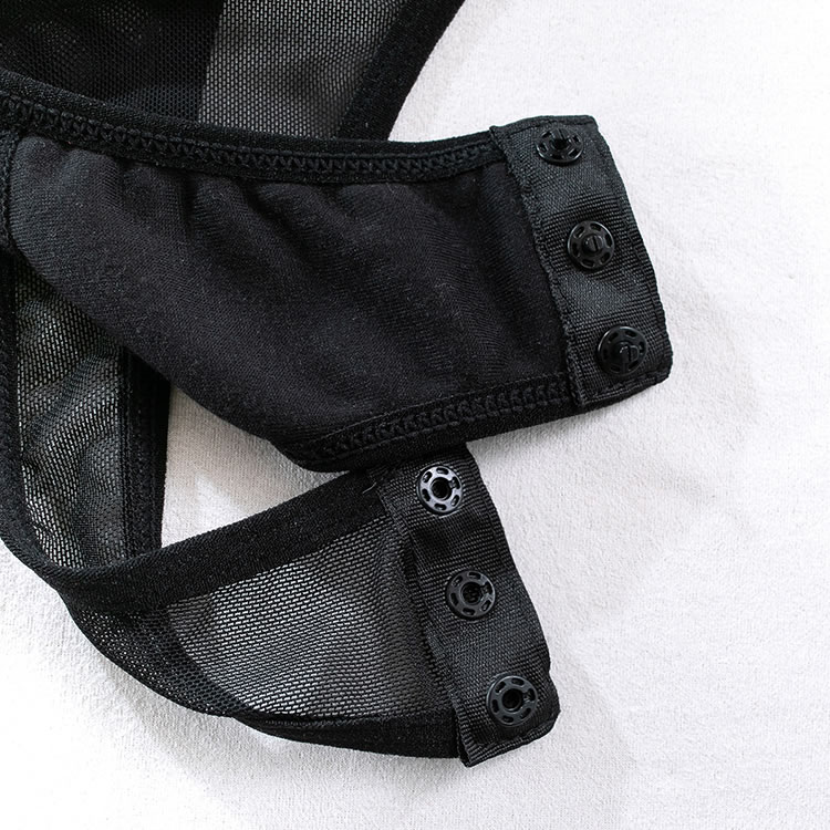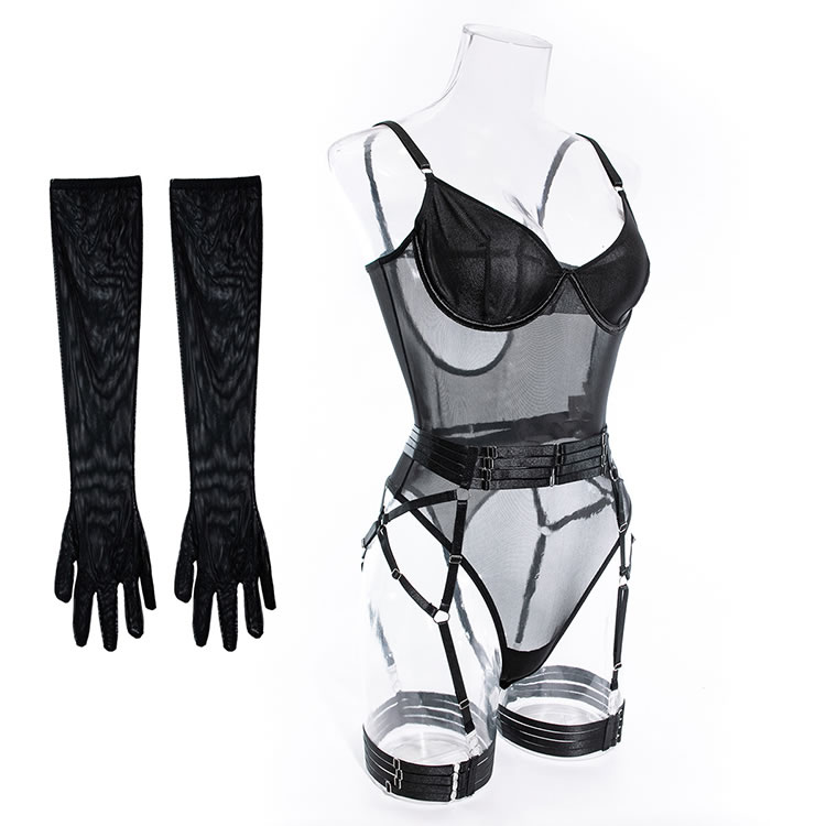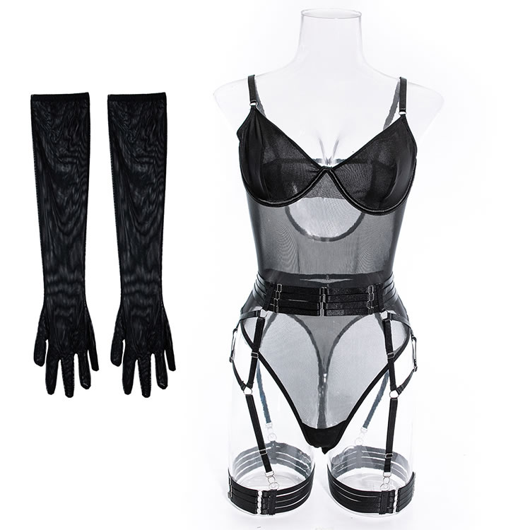 Tease a sexy peek in this exclusive teddy set featuring solid cups, adjustable spaghetti straps, a hook back closure with a keyhole, a sheer bodice, a snap crotch, a cheeky cut back, and a strapped garter belt, adjustable garter straps, and wraparound leg garters, and matching gloves.