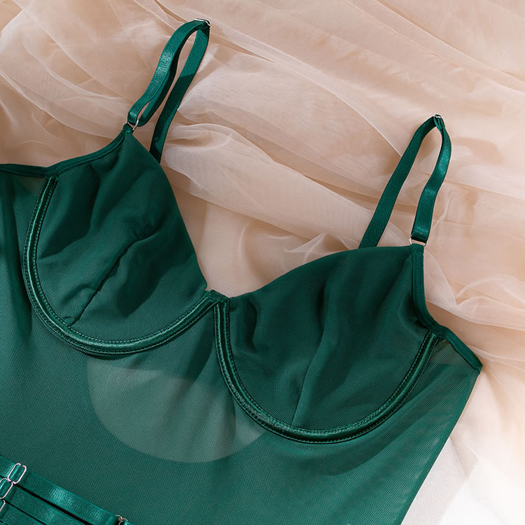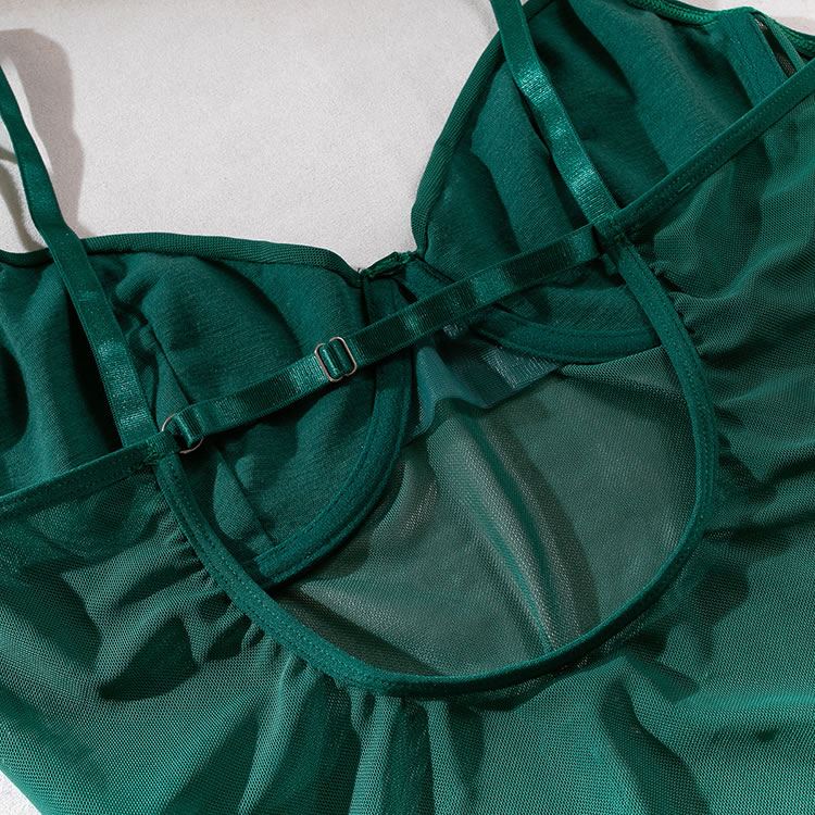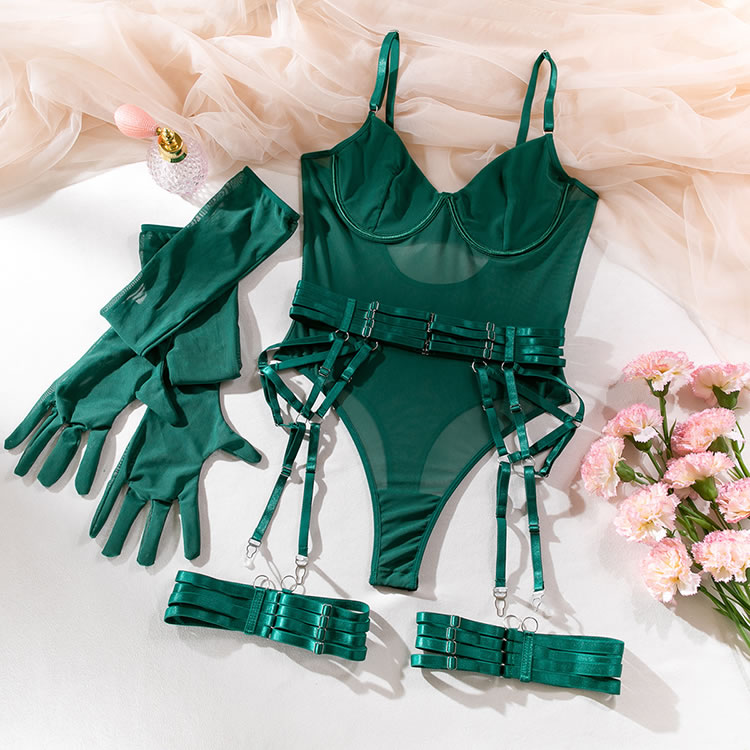 Tease a sexy peek in this exclusive teddy set featuring solid cups, adjustable spaghetti straps, a hook back closure with a keyhole, a sheer bodice, a snap crotch, a cheeky cut back, and a strapped garter belt, adjustable garter straps, and wraparound leg garters, and matching gloves.