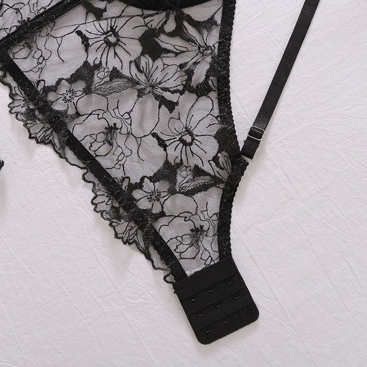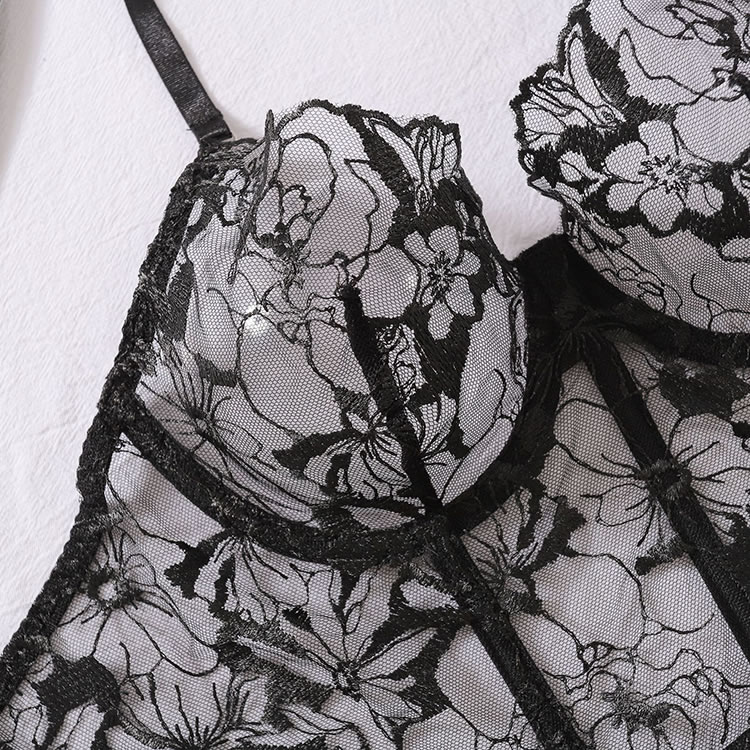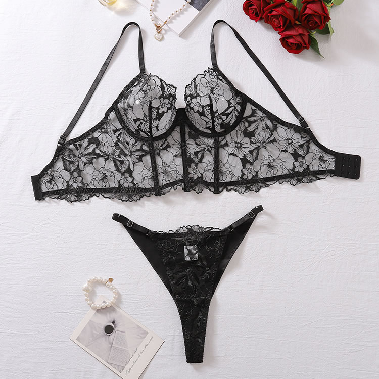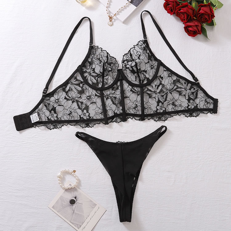 Unveil your allure in this captivating bra set, featuring delicate sheer mesh underwire cups adorned with floral embroidery, a lace underbust band for added elegance, adjustable spaghetti straps, a hook and eye back closure, and a matching panty with a flirty cheeky cut back.
