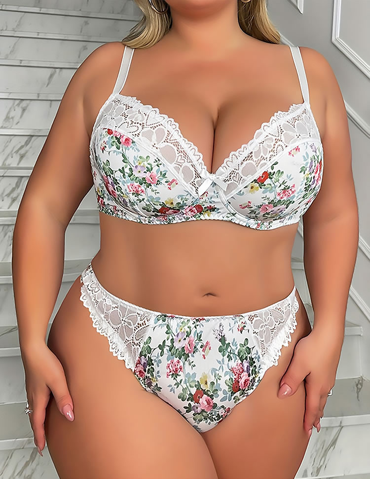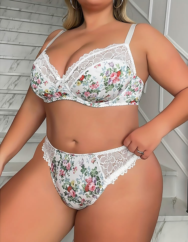 Step into elegance with this charming floral plus size lingerie set. The intricate lace detailing and vibrant floral print create a visually stunning look that accentuates your natural curves. Designed for comfort, the soft fabric ensures all-day wearability, making it perfect for both special occasions and everyday use.