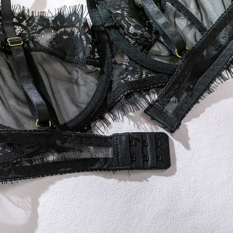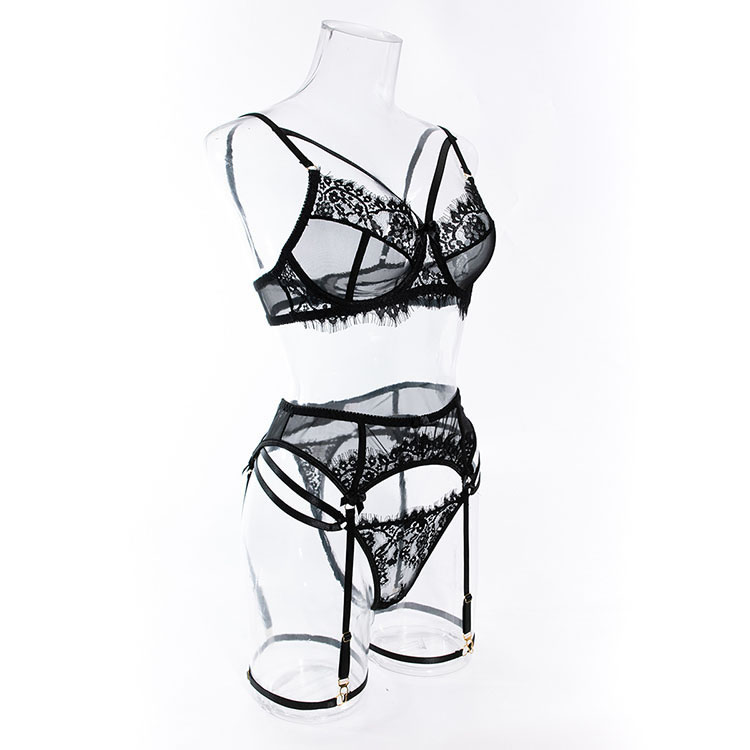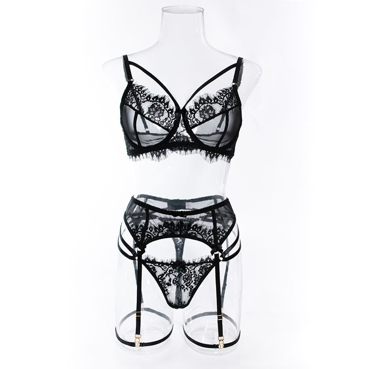 Tempt and tease in this sultry eyelash lace bra set featuring underwire cups with a scalloped lace trim, adjustable spaghetti straps, a hook and eye back closure, a high waisted garter belt with a hook and eye back closure, adjustable garter straps, wraparound leg garters, and a matching panty with a thong cut back.