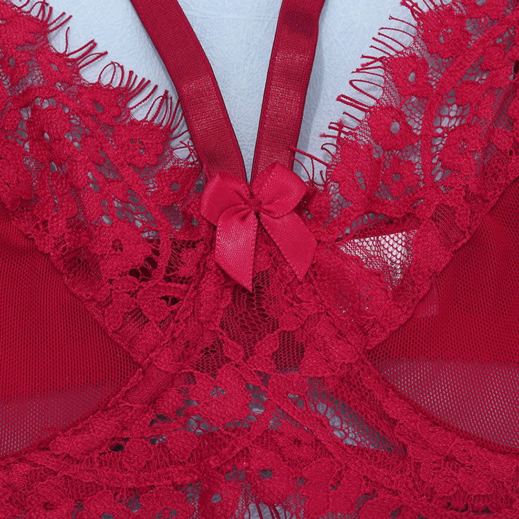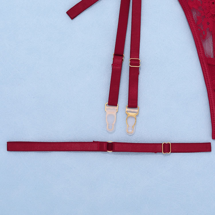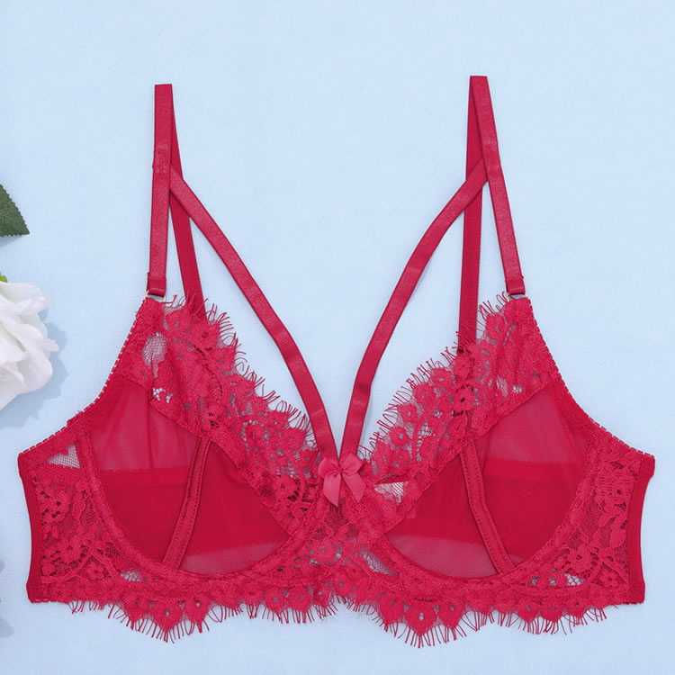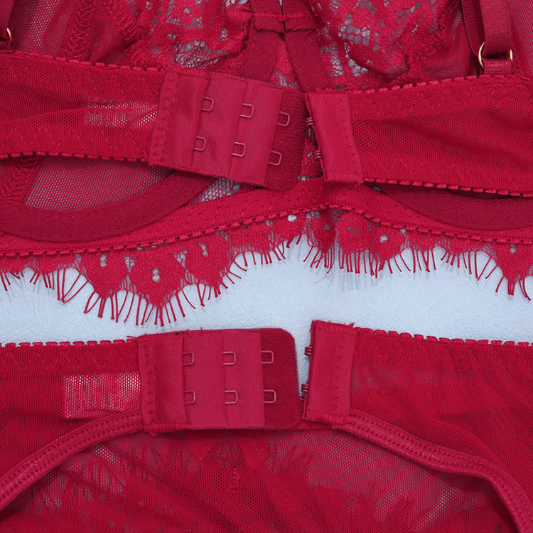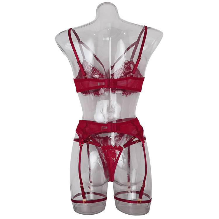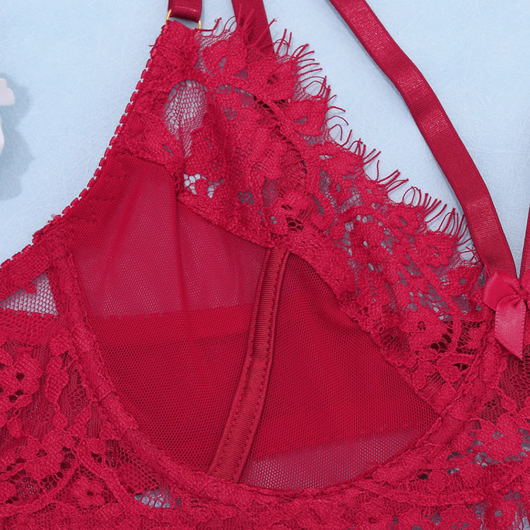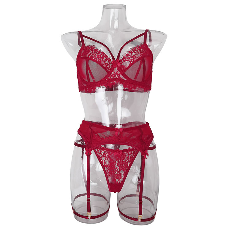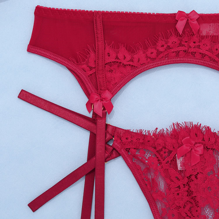 Tempt and tease in this sultry eyelash lace bra set featuring sheer mesh cups with an eyelash lace trim, adjustable spaghetti straps, a hook and eye back closure, a matching garter belt with adjustable garter straps, wraparound leg garters, and a matching thong panty.