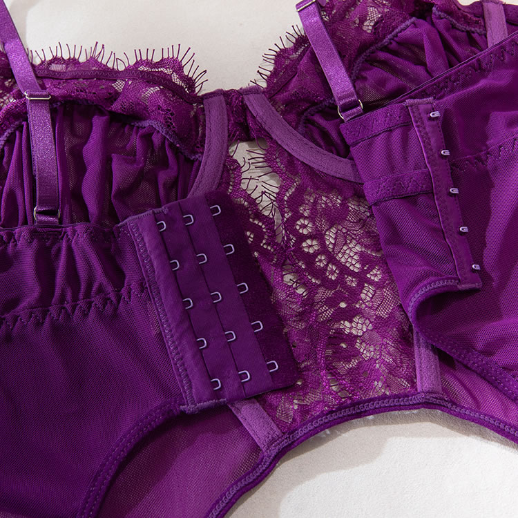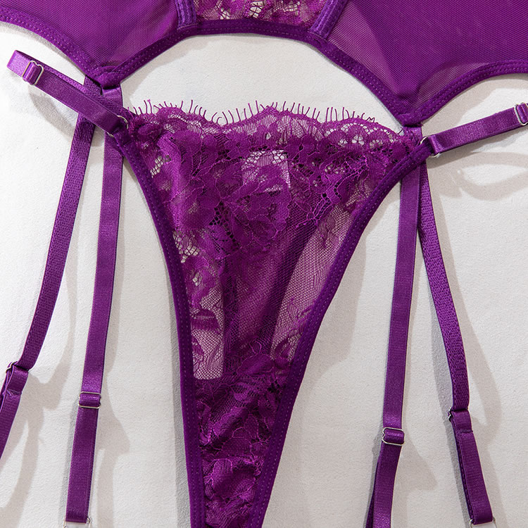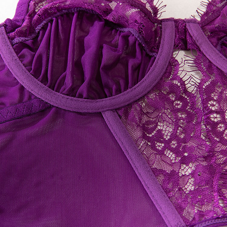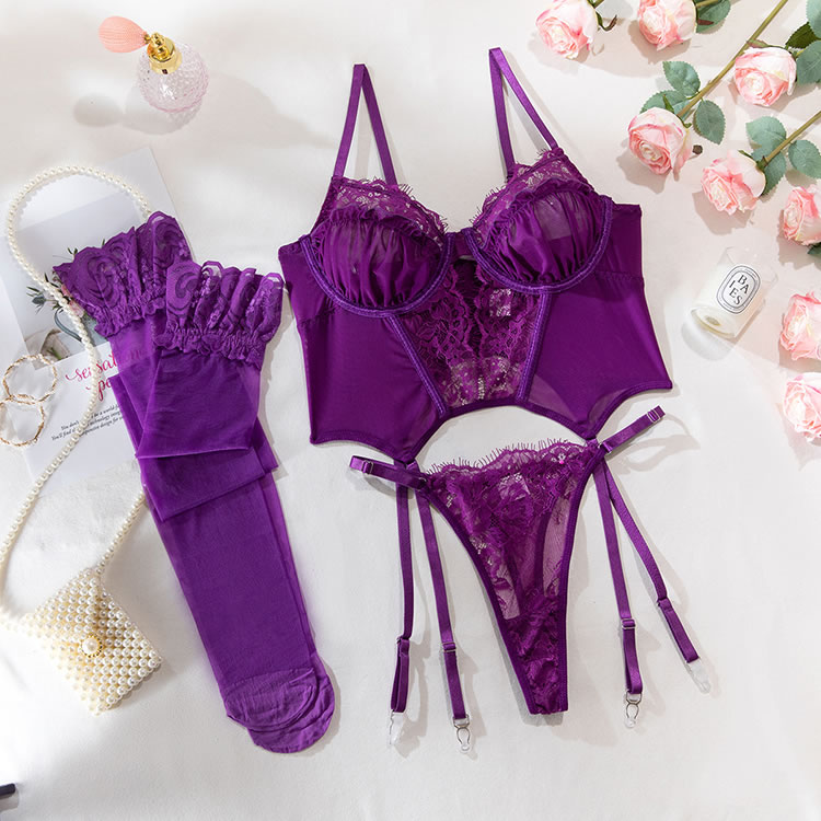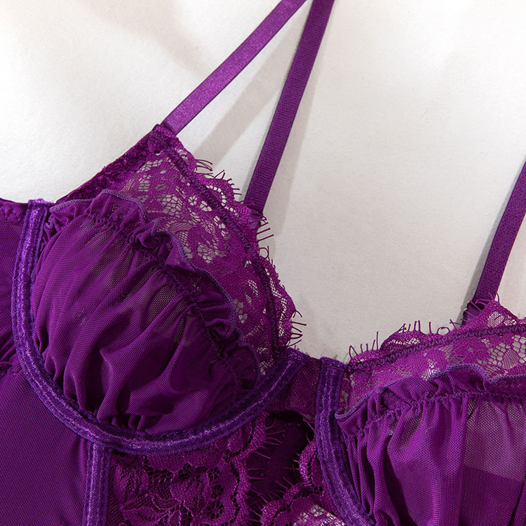 Illuminate your boudoir with this stunning lace bustier set. Featuring sheer lace underwire cups, adjustable spaghetti straps, front keyhole cut-outs, adjustable garter straps, a matching thong panty, and coordinating thigh-high stockings with lace tops, this ensemble is designed to enchant and delight.