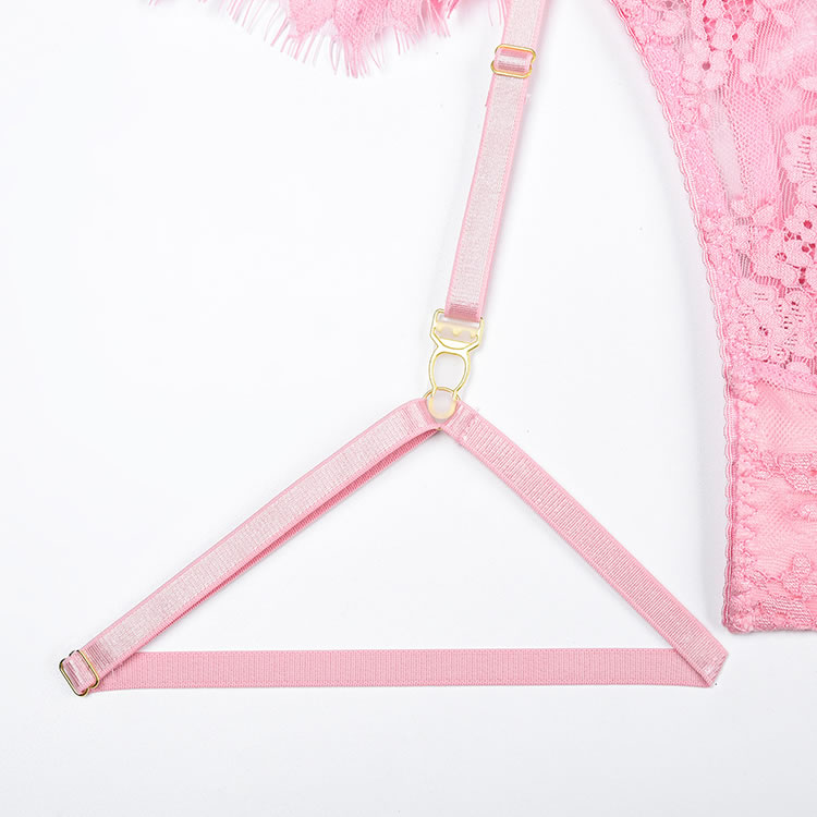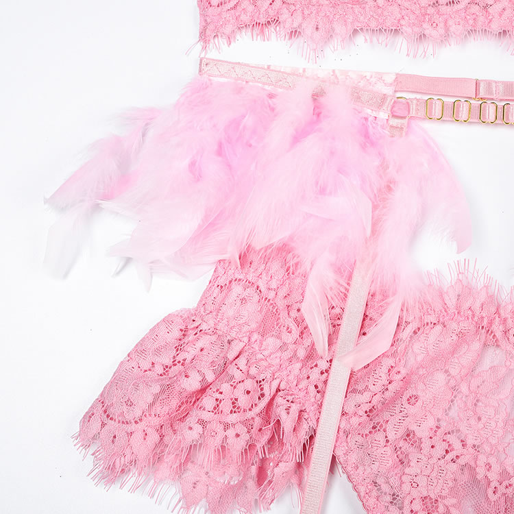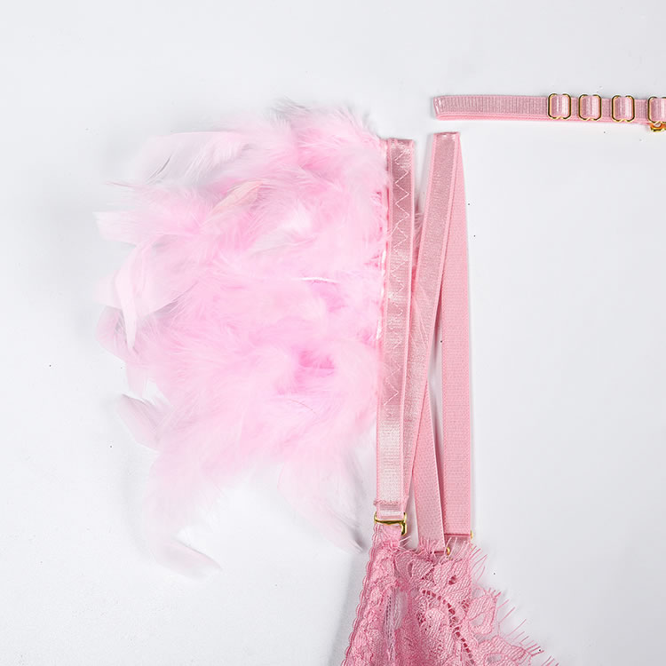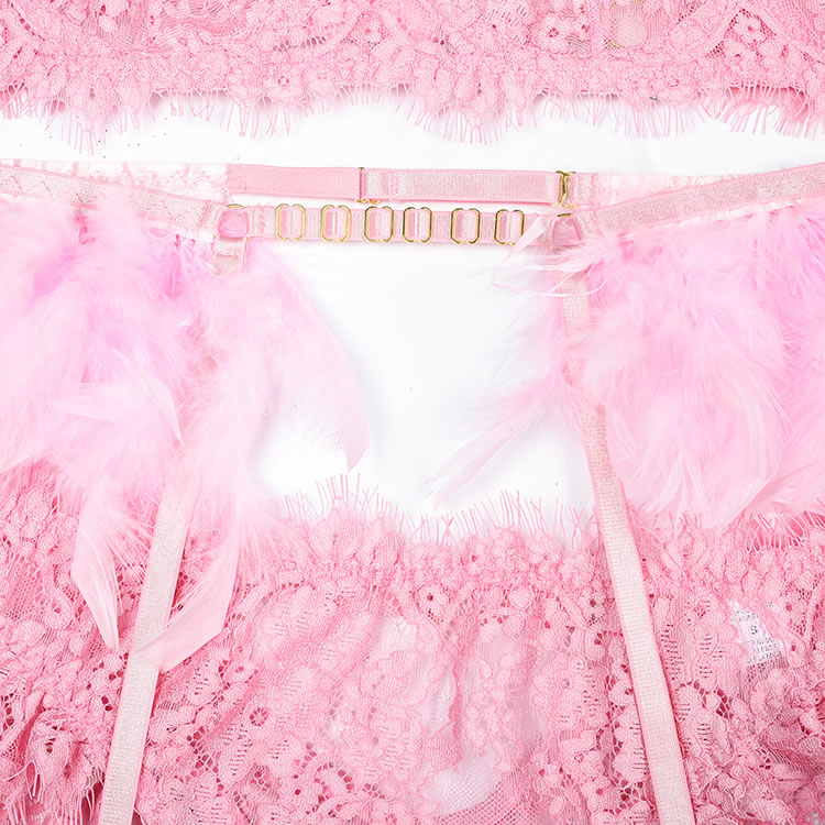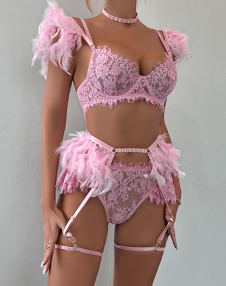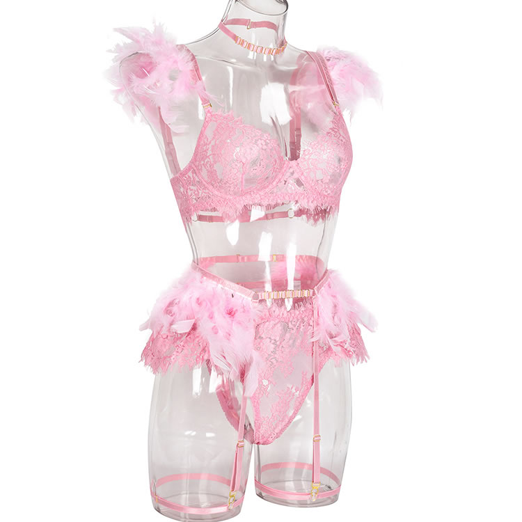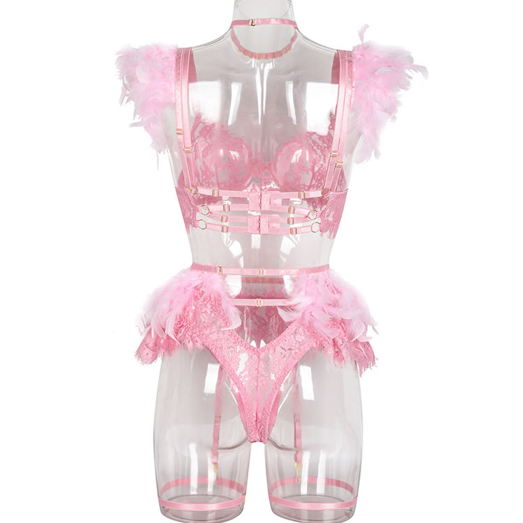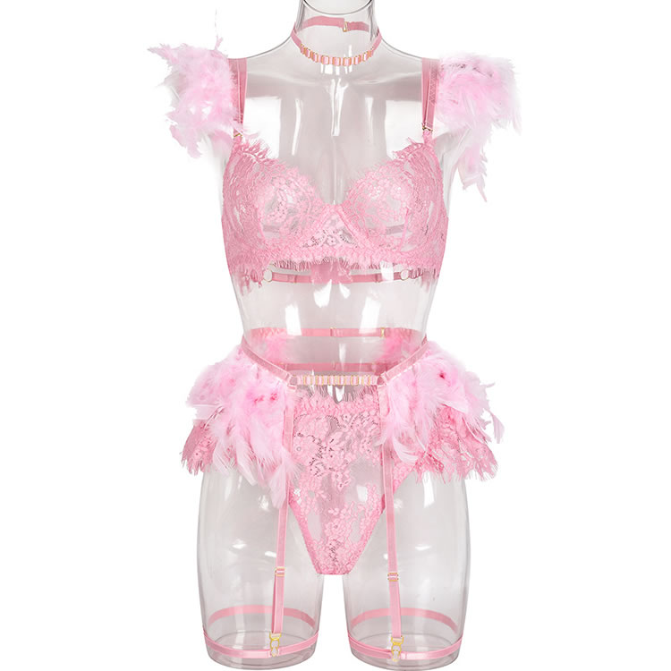 Indulge in the epitome of glamour with this captivating bra set. Revel in the sheer lace underwire cups that adorn your curves, complemented by adjustable spaghetti straps featuring delicate Tail Feather accents. The allure continues with a captivating caged back band, secured by a convenient hook-and-eye closure. Complete the ensemble with a coordinating high-waisted garter belt, equipped with adjustable garter straps, wraparound leg garters, an elegant Choker, and a matching panty. Embrace sophistication and confidence as you adorn yourself in this stunning lingerie ensemble.