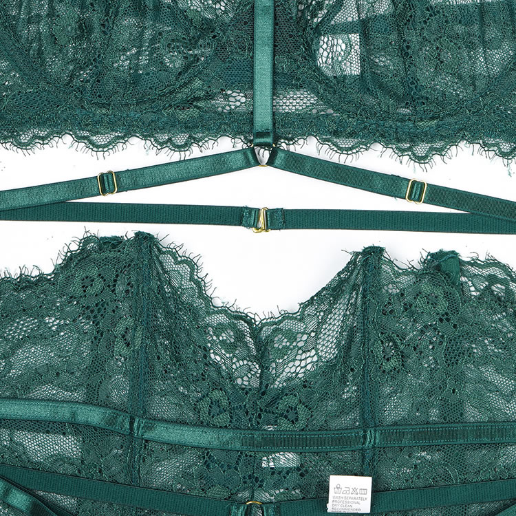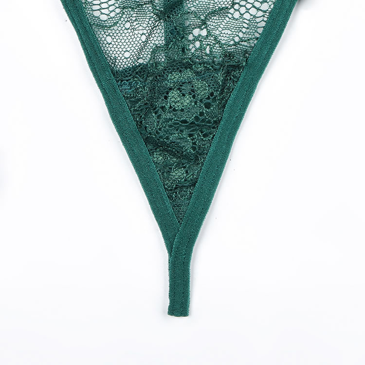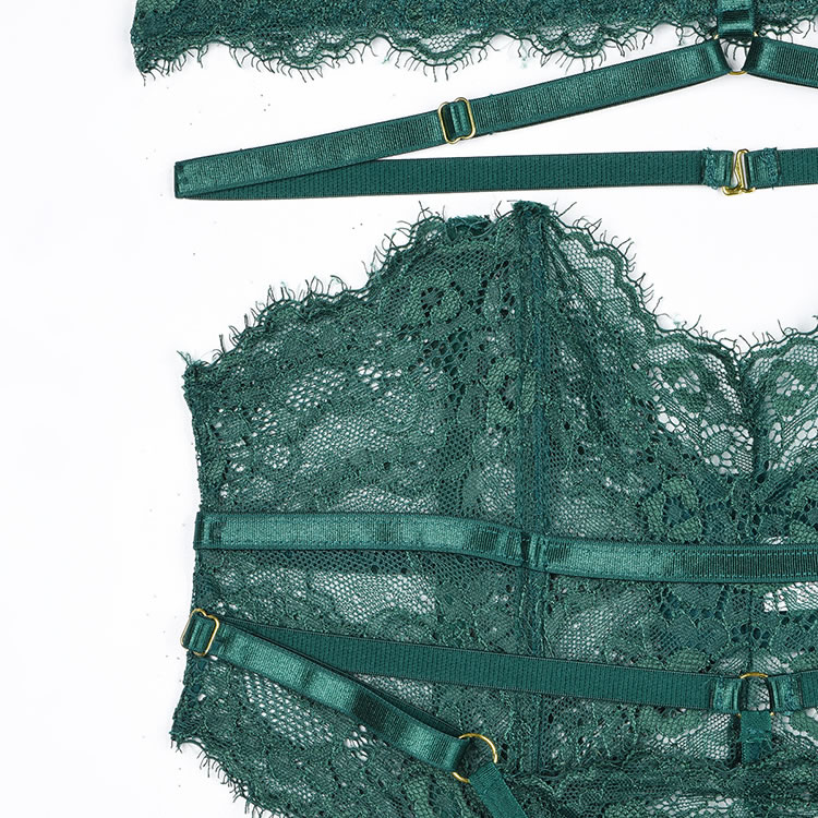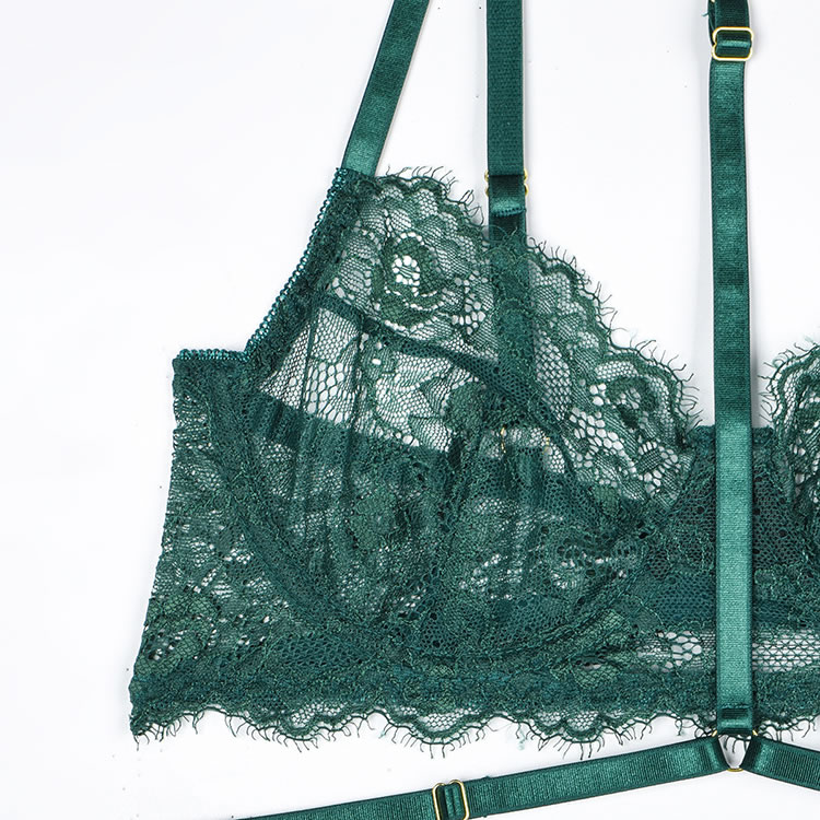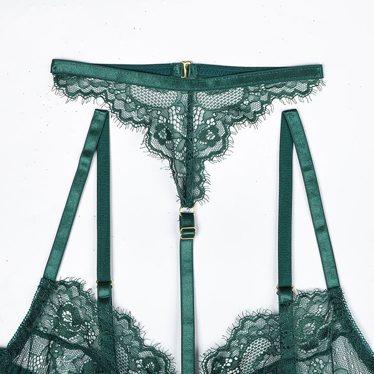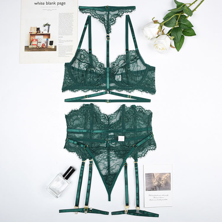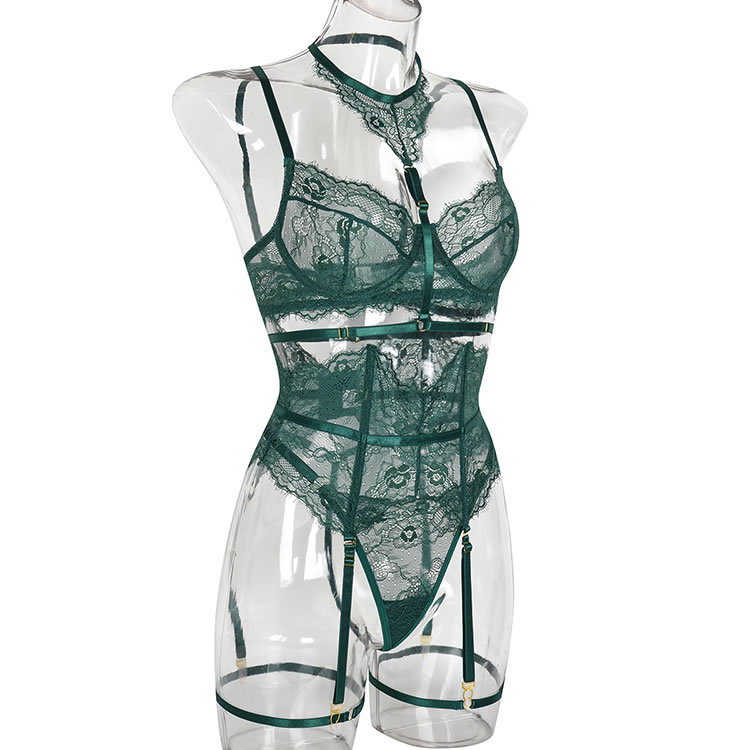 Strike a daring pose in this lace bra set featuring sheer lace underwire cups, adjustable spaghetti straps, a hook and eye back closure, choker neck, a matching lace garter belt with adjustable garter straps, adjustable wraparound leg garters, and a matching thong panty.