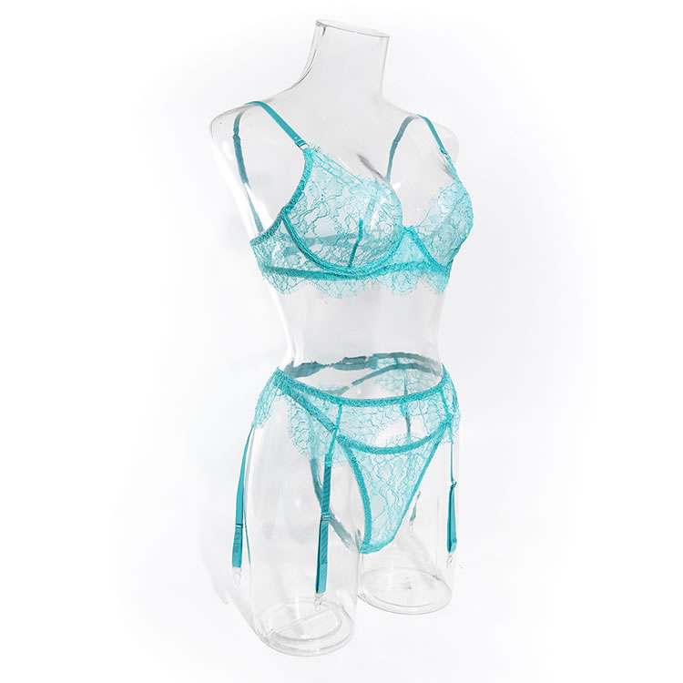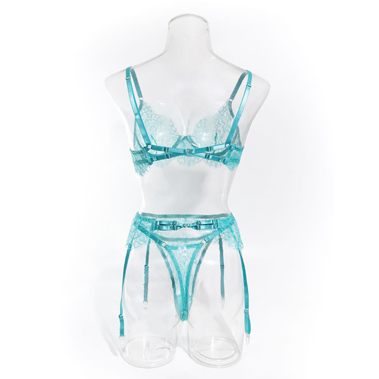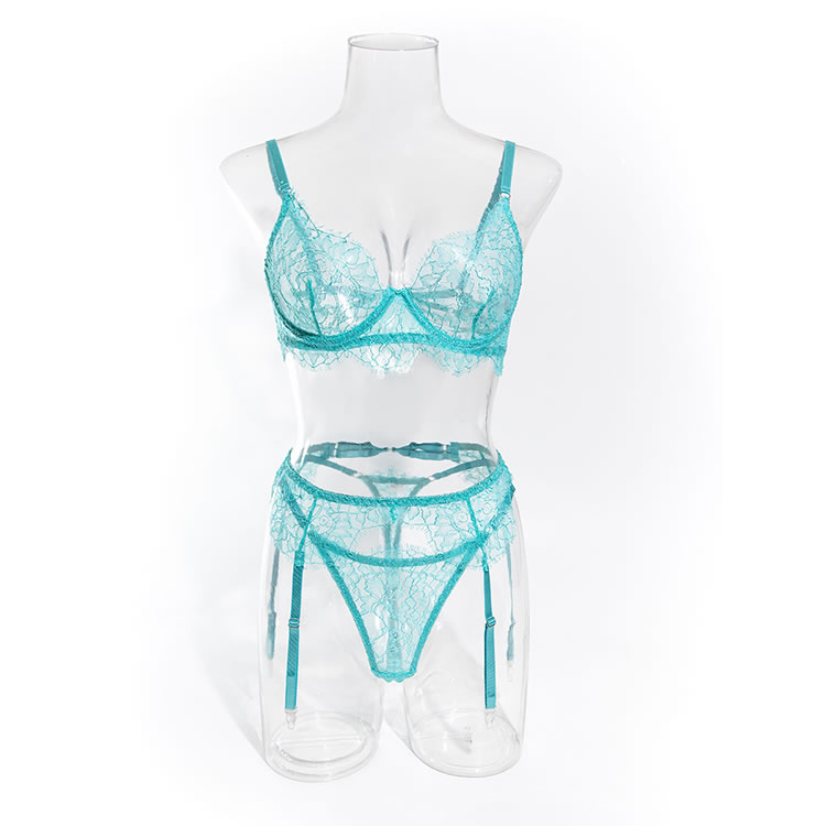 Strike a daring pose in this lace bra set featuring sheer lace underwire cups, adjustable spaghetti straps, a hook back closure, a matching lace garter belt with adjustable garter straps, and a matching thong panty. (Stockings not included.)