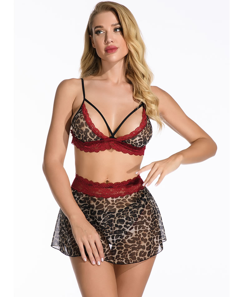 Count on those nine lives in this ultra sassy bra set featuring sexy mesh animal print triangle cups with strappy bust detailing, adjustable spaghetti straps, a matching high waisted mini skirt, and a matching panty.