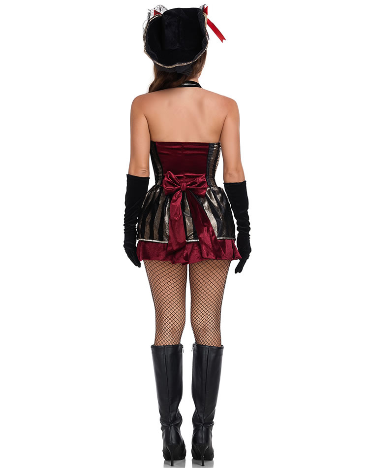 Set sail with bold style in this playful pirate-inspired costume that blends adventure and flair. Featuring a mini dress in deep red with gold trim and a skull-and-crossbones accent, the outfit includes a flared skirt with black and metallic stripes and a matching red bow at the back. Paired with a tricorn hat adorned with red ribbons, long gloves, it’s perfect for Halloween parties, themed events, or cosplay. ( Fishnet stockings, and knee-high boots not included)