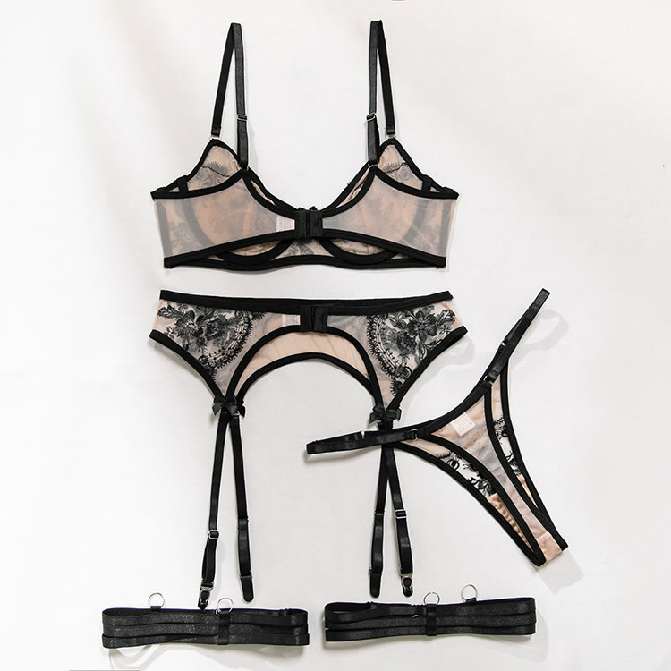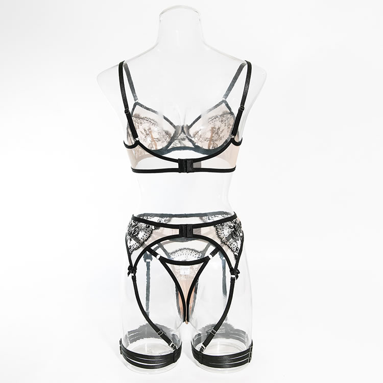 This elegant black lace garter set is a perfect choice for those who appreciate intricate designs and a touch of allure. The bra features detailed floral lace patterns that enhance its charm, while the matching panties and garters offer a flattering fit. Ideal for anyone seeking a blend of style and confidence in their lingerie.