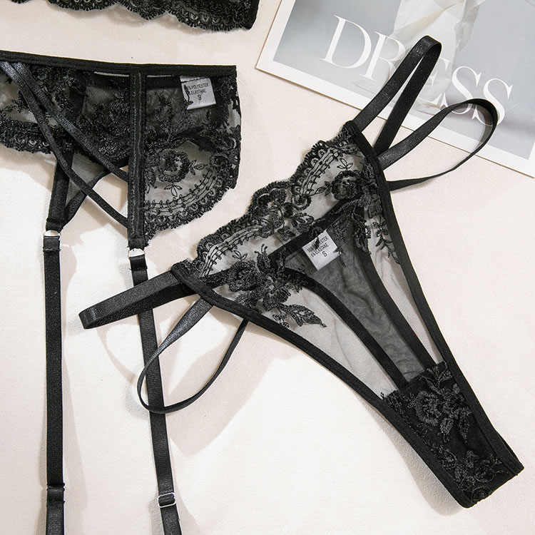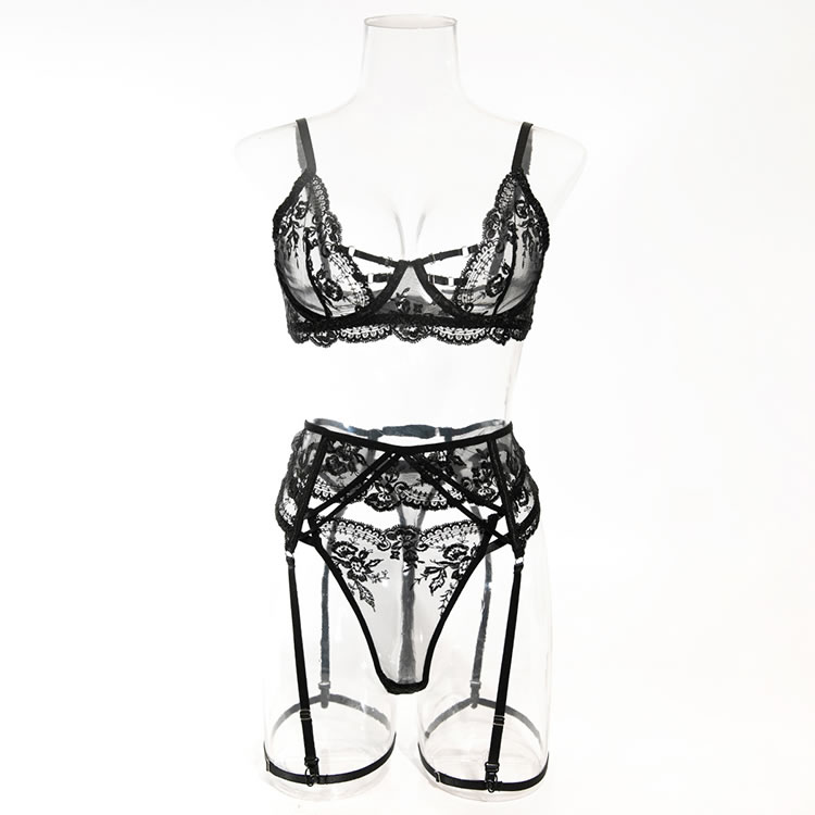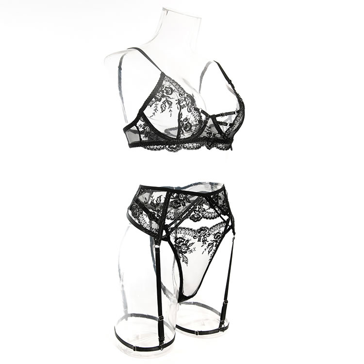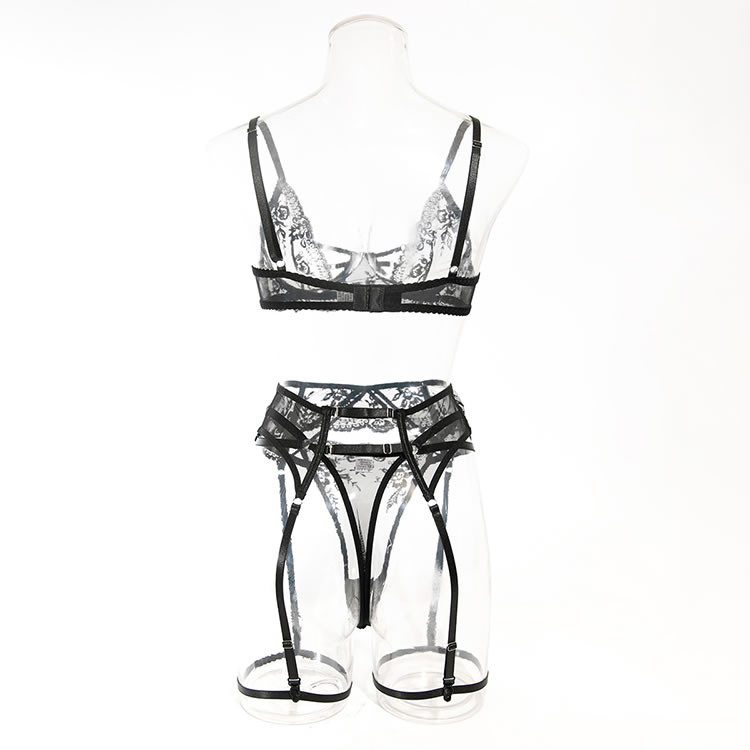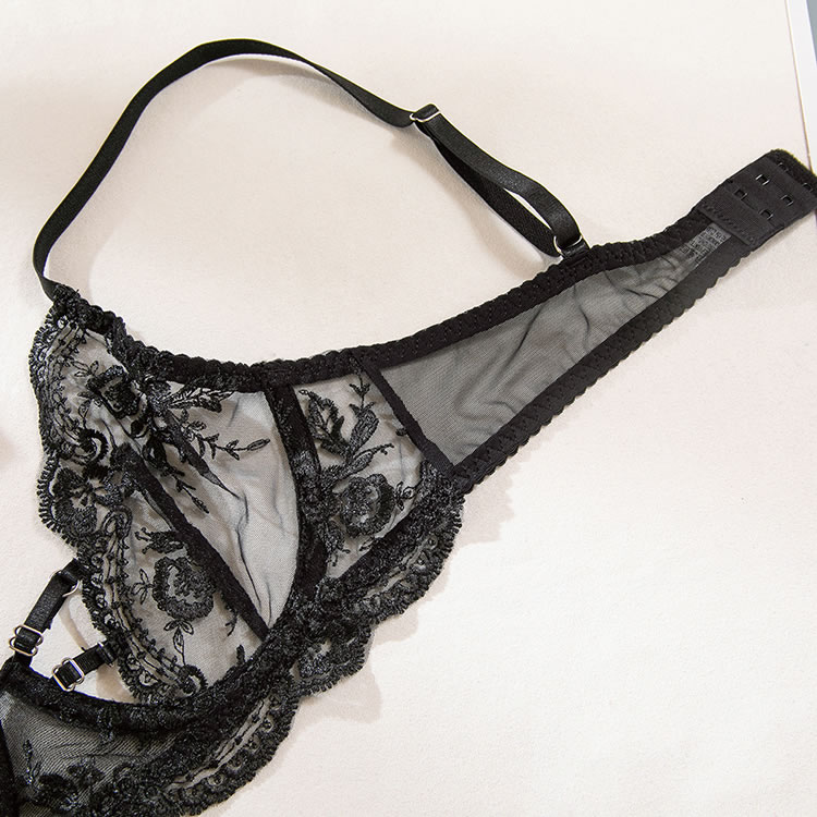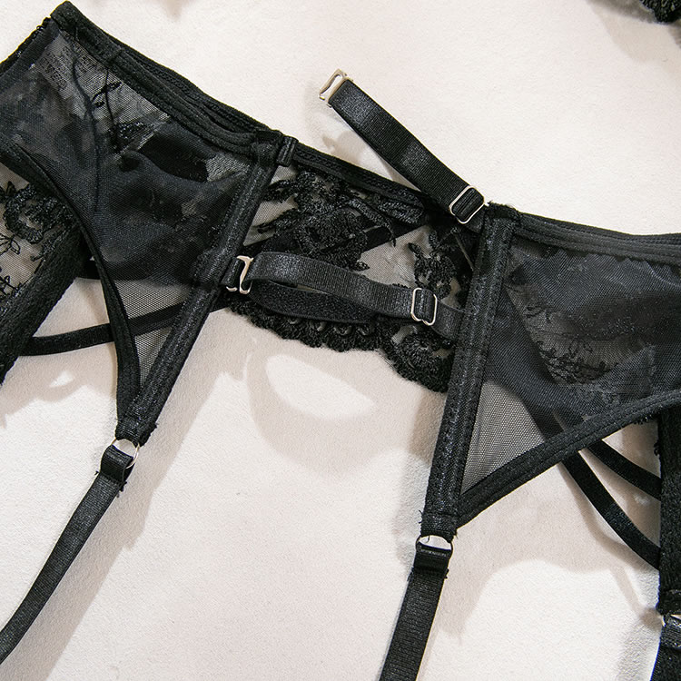 This exquisite lingerie set features a stunning black design with intricate lace detailing and sheer mesh fabric. The sweetheart neckline enhances the décolletage beautifully, while the strappy accents add a touch of allure and sophistication. The fitted design accentuates the figure, creating a flattering and elegant silhouette. The adjustable straps and garter belt ensure a comfortable and customizable fit, making it perfect for both intimate moments and stylish boudoir photoshoots.