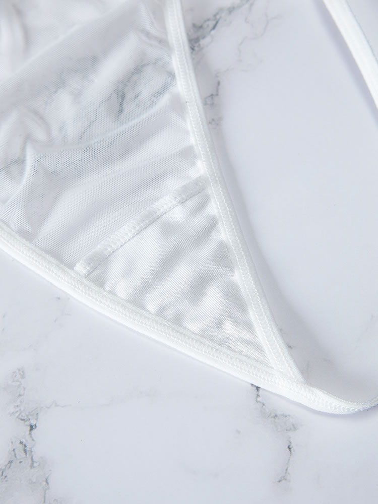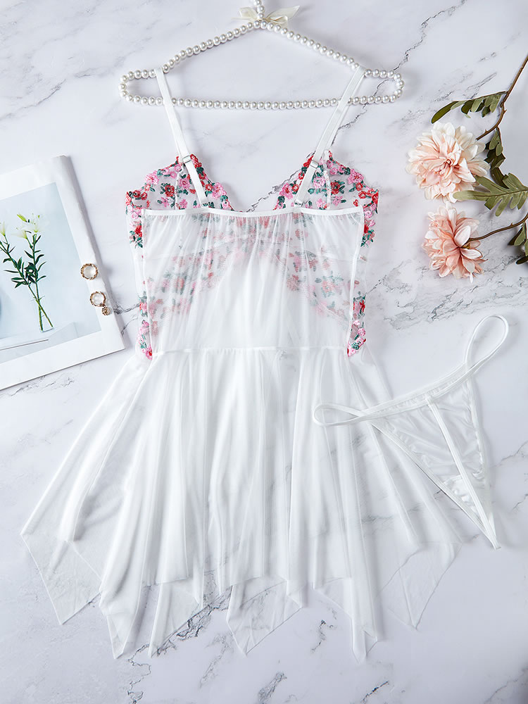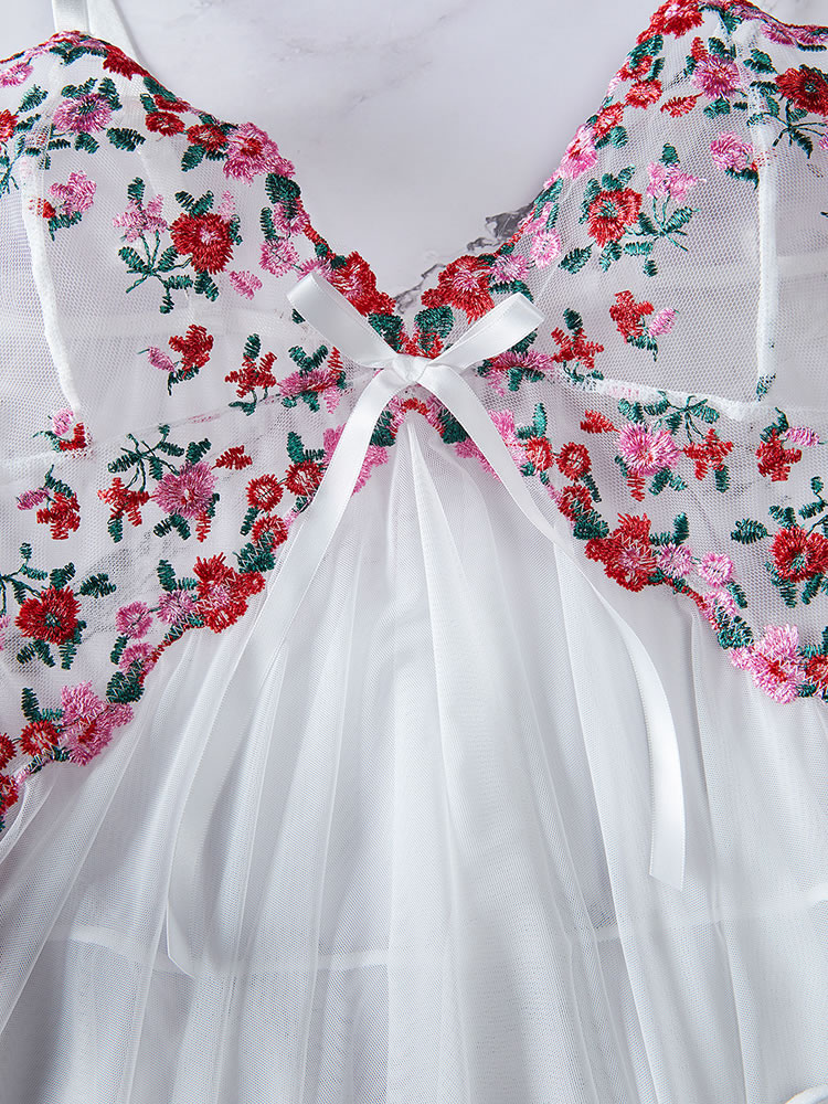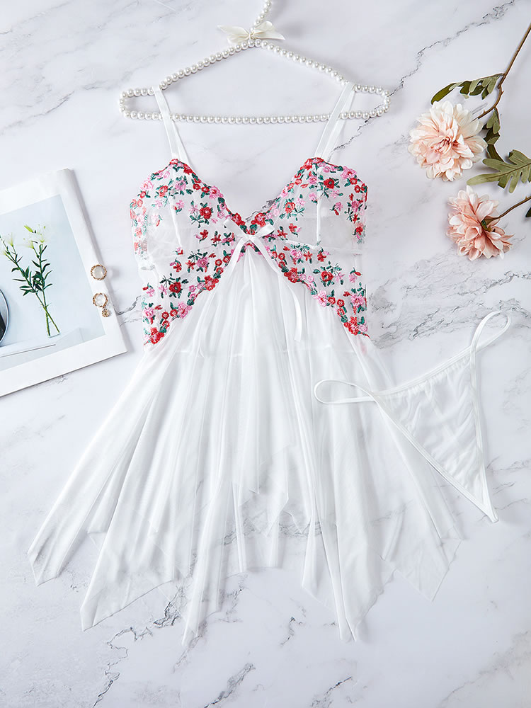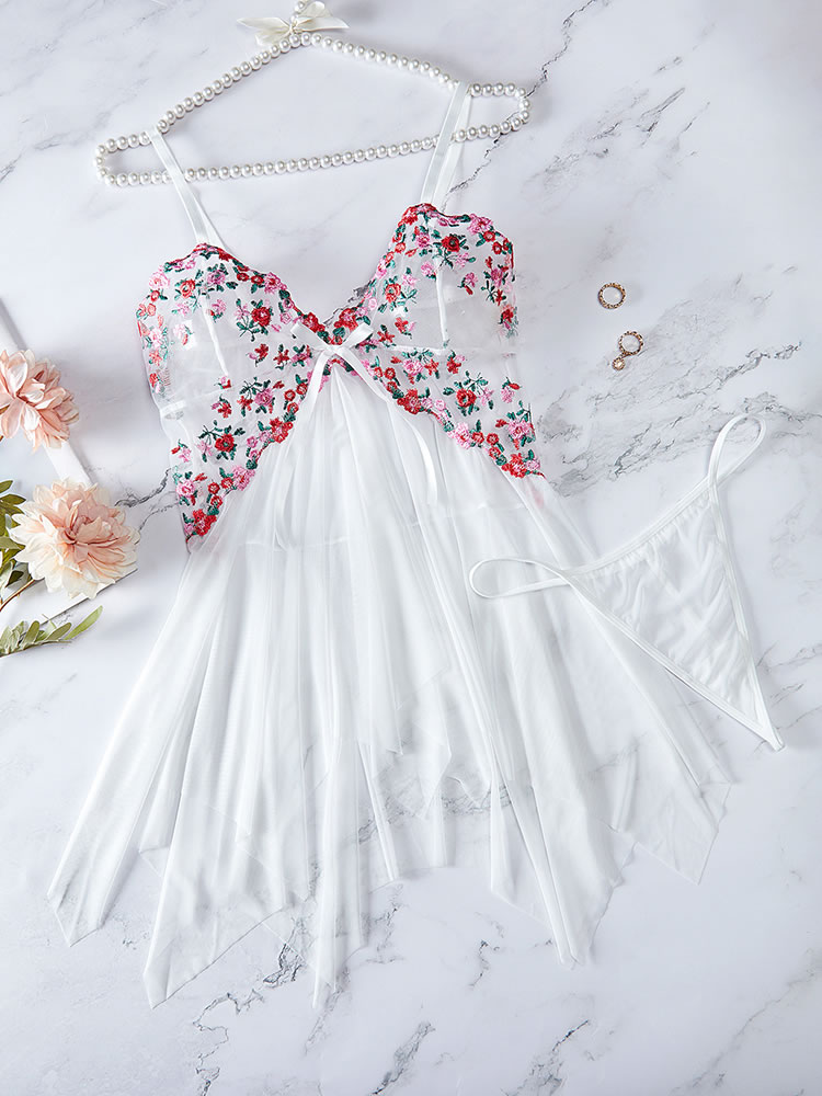 Blossom into a romantic sex kitten in this flirty babydoll set featuring sheer mesh cups with floral embroidery, a satin bow accent, adjustable spaghetti straps, a sheer mesh skirt, and a matching G-string.