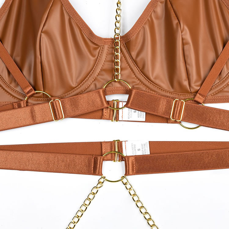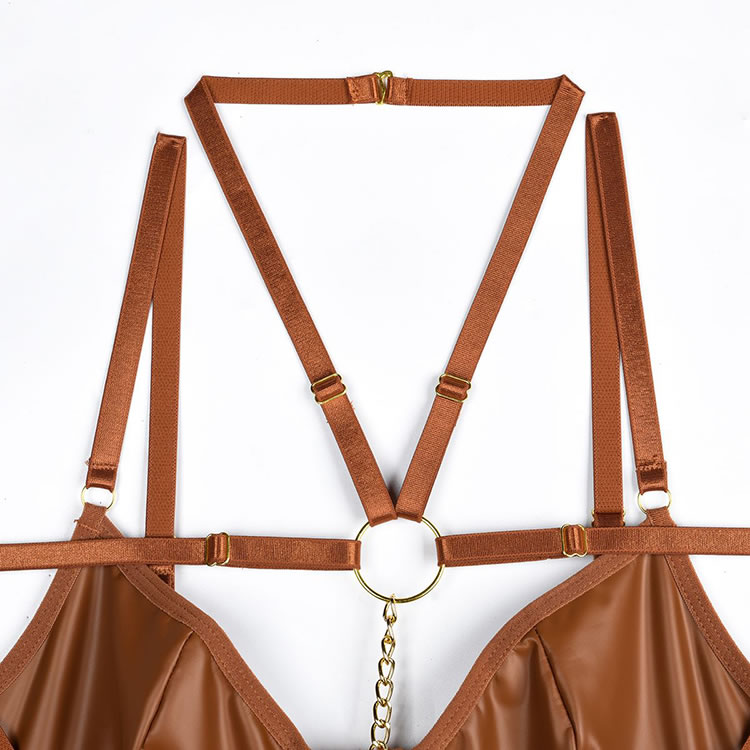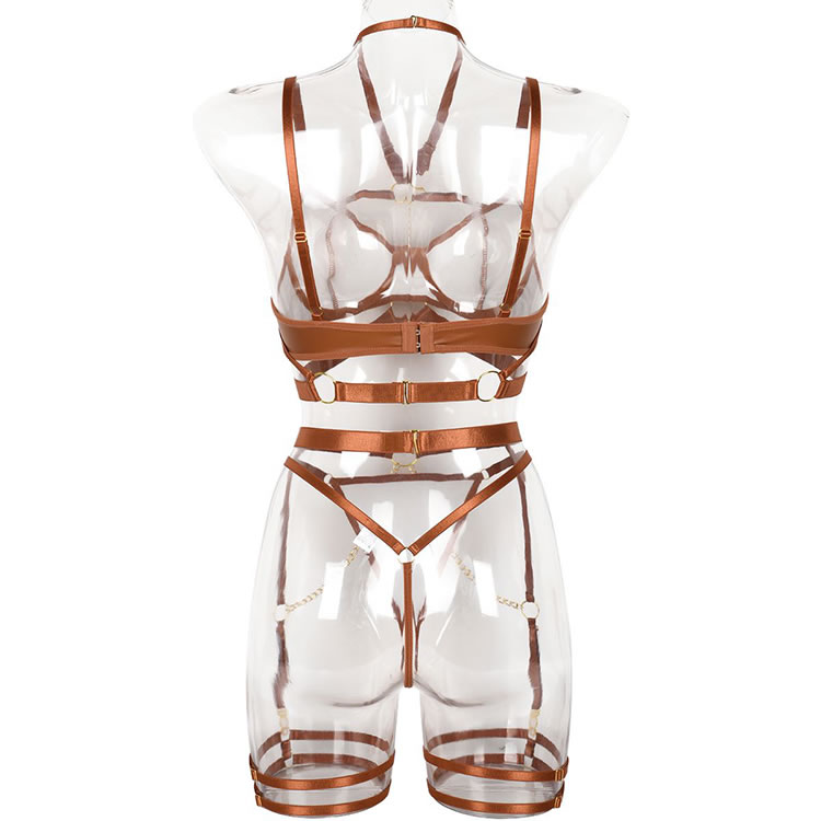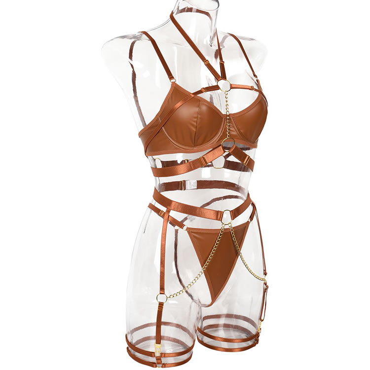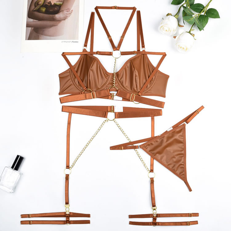 Submit to your every desire in this provocative bra set featuring underwire cups, adjustable spaghetti straps, a hook and eye back closure, a matching open cup bra set, a matching high waisted garter belt with adjustable garter straps, adjustable wraparound leg garters, and a matching thong.