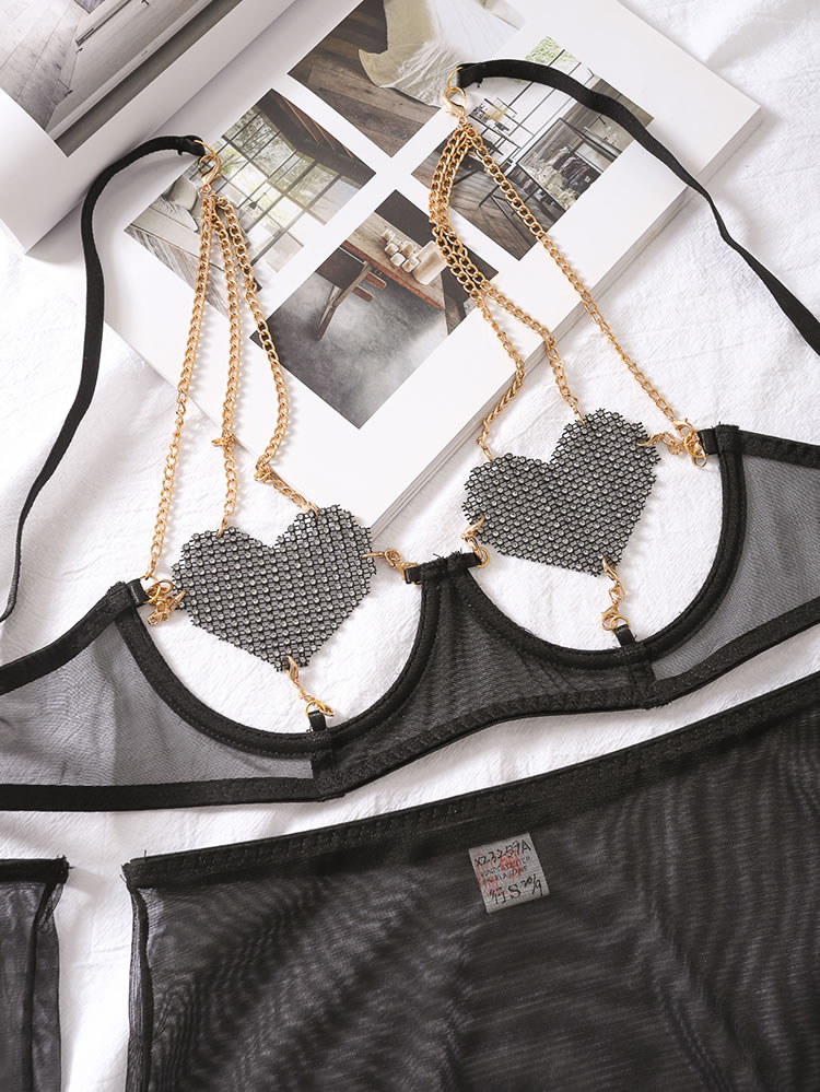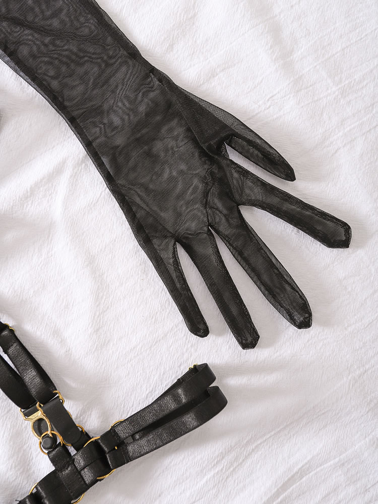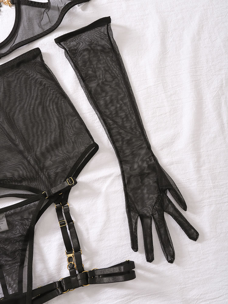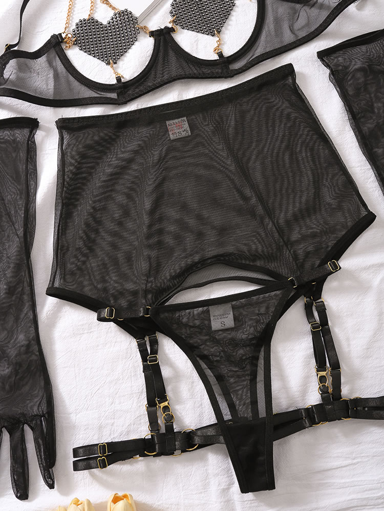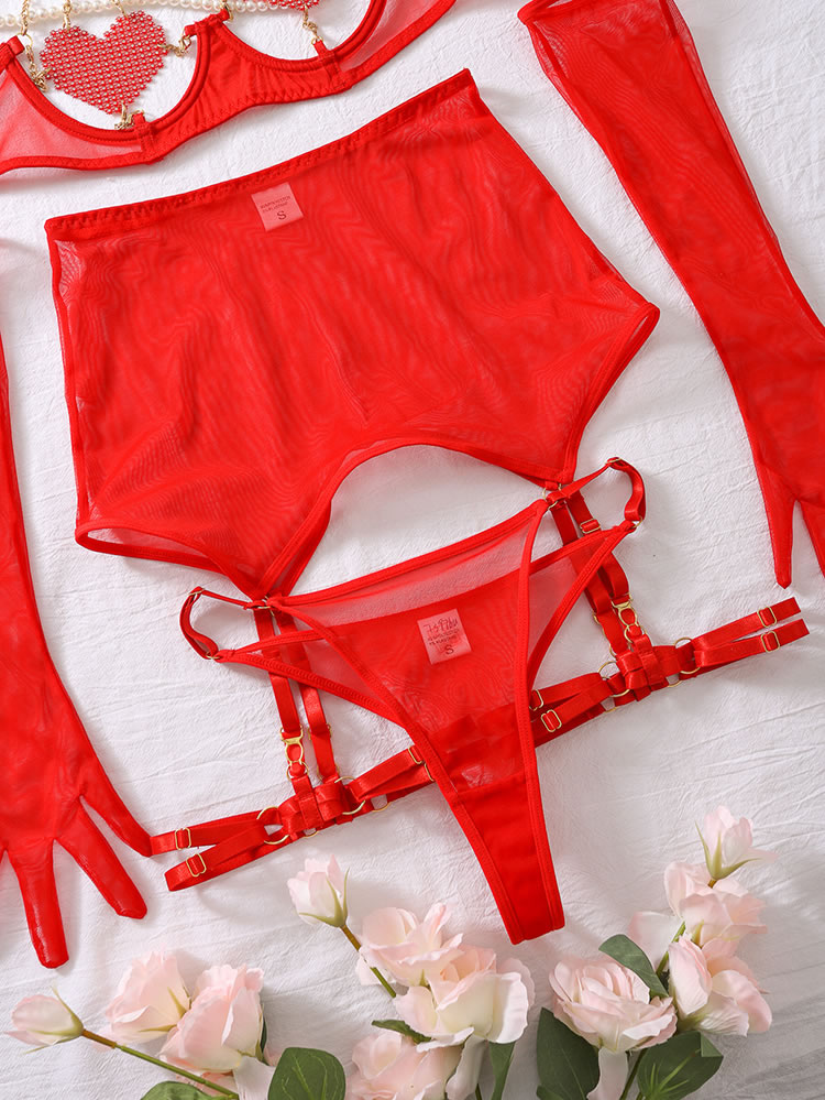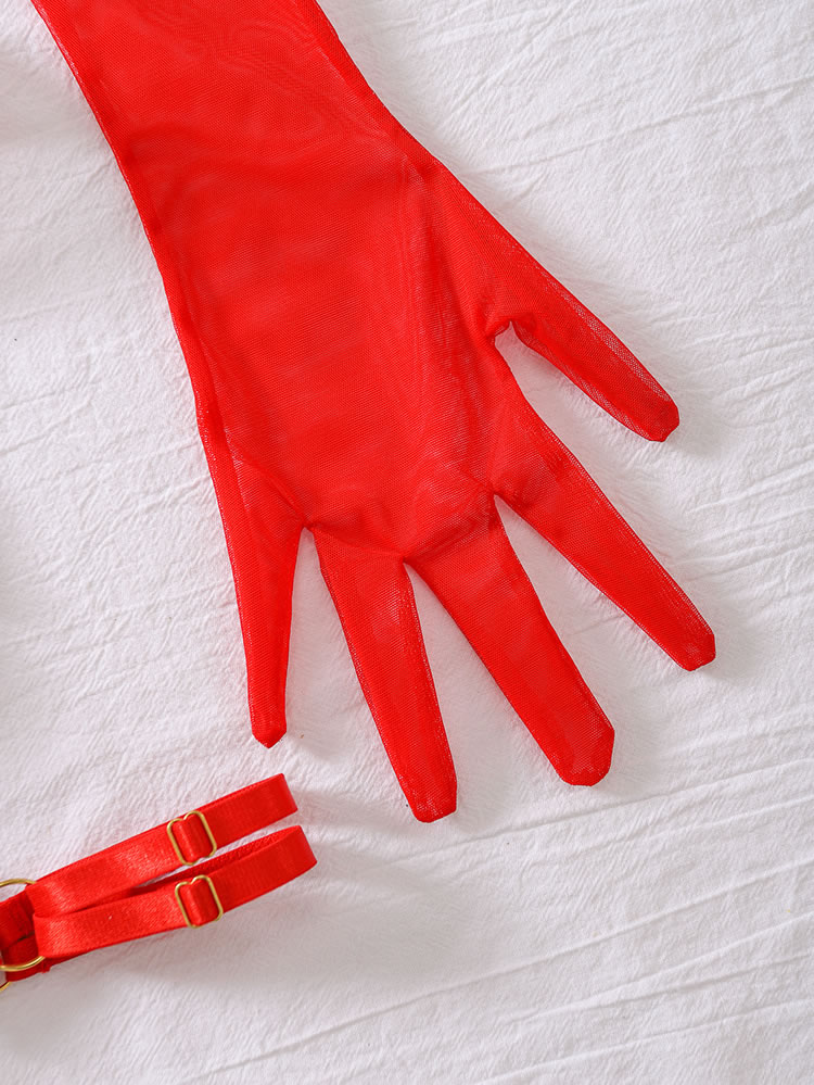 Embrace your sensual bond with this incredibly stylish exclusive bra set, now available in Black and Red. This 5-piece ensemble includes an underwire bra, featuring a striking cutout design detail, adjustable straps, and a convenient hook and eye back closure. Additionally, it comes with a garter belt equipped with adjustable straps, wraparound leg garters, a matching thong panty, and gloves to complete the seductive ensemble.