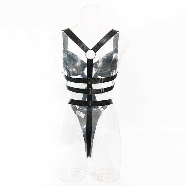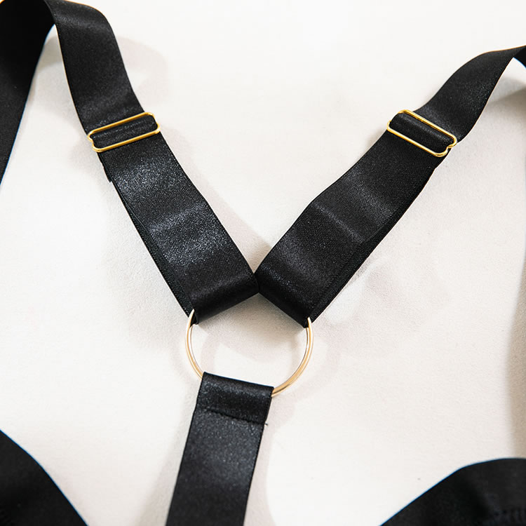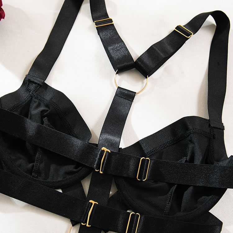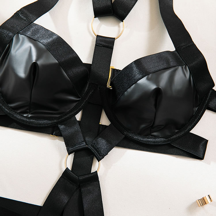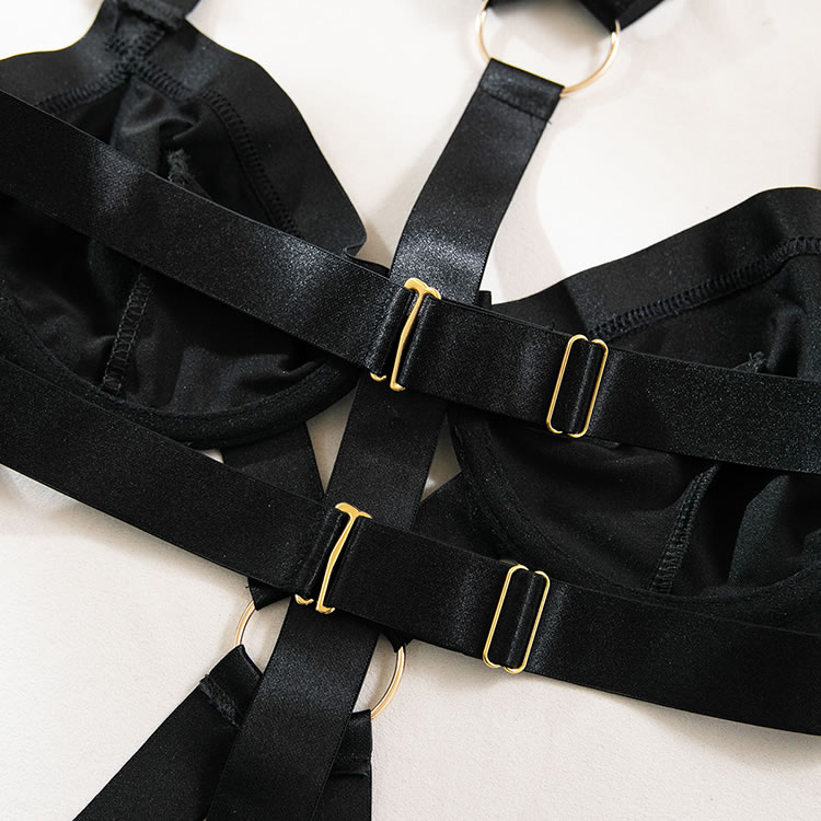 Indulge in the seductive allure of this black strappy lingerie set. The bra features a sleek, smooth design with bold straps and a central gold ring accent, providing a blend of elegance and modern edge. The underwire cups offer support and shape, while the adjustable straps ensure a comfortable fit. The matching high-cut thong complements the set with its intricate strap detailing and center seam, making it perfect for both intimate moments and special occasions.