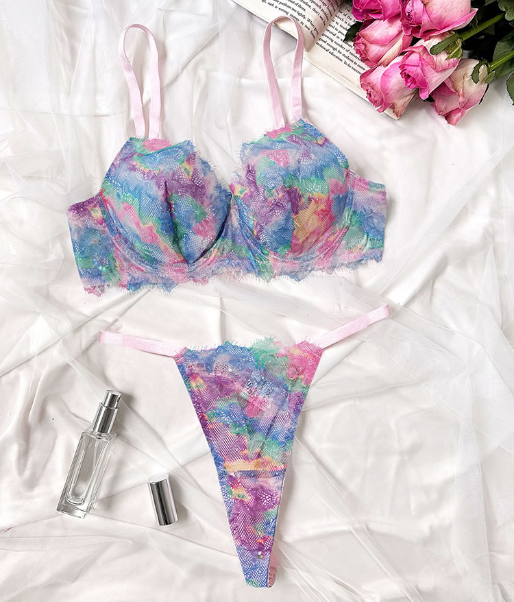 Ignite passion with this alluring bra set, designed to captivate. Featuring sheer lace underwire cups that offer a hint of seduction, adjustable spaghetti straps for a perfect fit, and a hook and eye back closure for added allure. The matching thong panty completes the ensemble, making this set the ultimate choice for creating unforgettable moments.