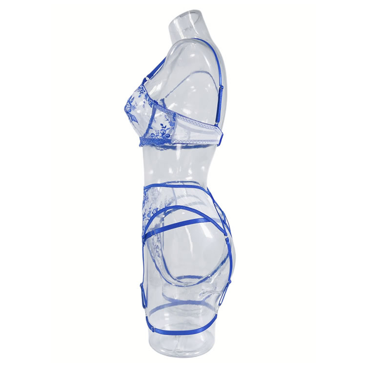 Brighten up your boudoir in this flirty lingerie set featuring a sheer, underwire bra with floral embroidery, adjustable spaghetti straps, a hook and eye back closure, a matching garter belt, adjustable garter straps, wraparound leg garters, a matching thong panty.