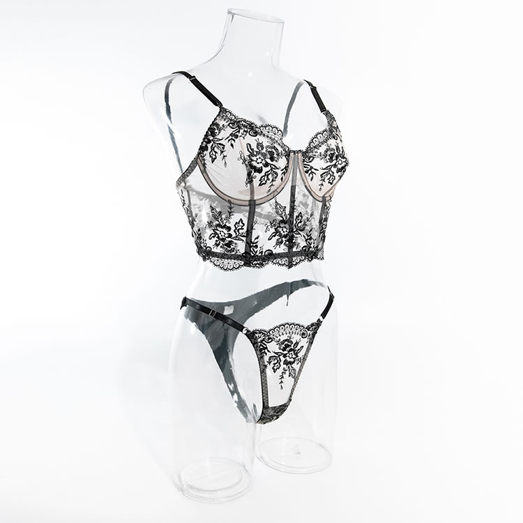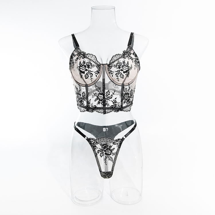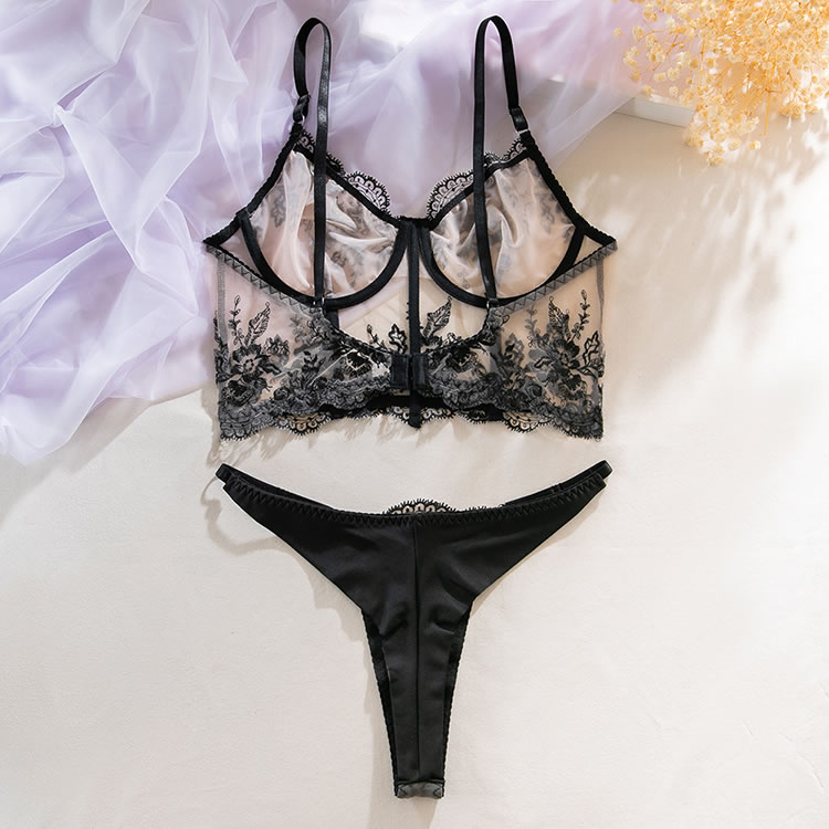 Floral Embroidery Mesh Underwire Sexy Lingerie Set Including Bra And Thong