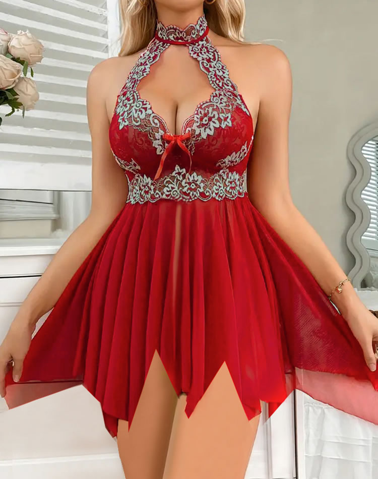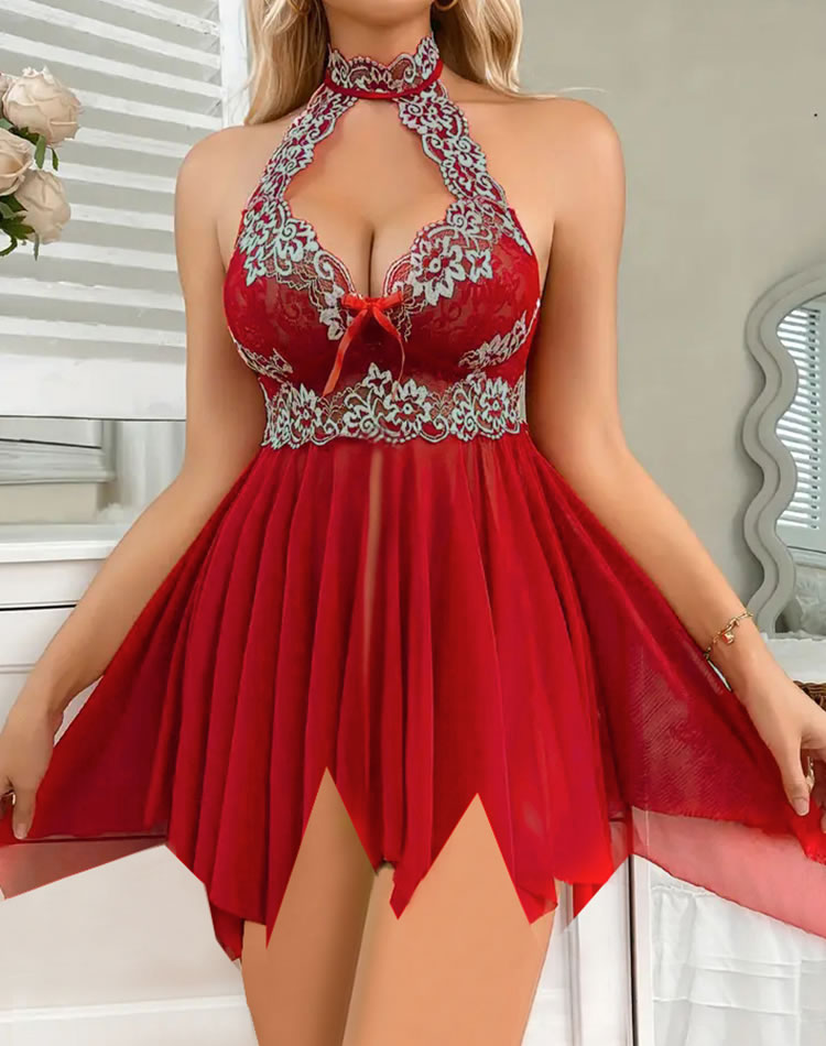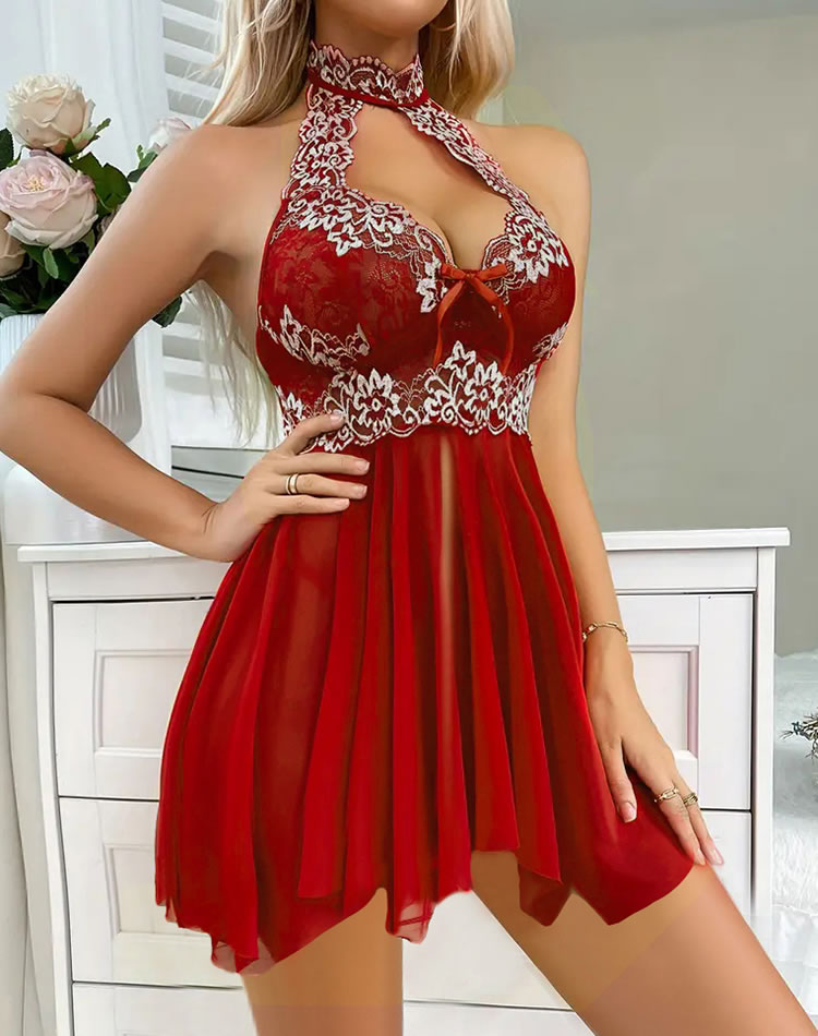 Ignite desire in this captivating babydoll set, featuring a seductive high choker neckline and sheer lace cups with satin bow accents. The romantic lace underbust band enhances your curves, while the flowing sheer mesh skirt adds a flirty, elegant touch. Paired with a matching G-string, this set is perfect for tempting your lover and making every moment unforgettable.