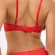 This bold red lingerie set features a mix of sheer mesh and detailed lace patterns across both the bra and panties. The bra has a classic underwire design with thin straps, adding a playful touch. The cups are outlined with floral lace that creates a soft, textured look, while the band offers gentle support. The matching high-cut panties follow the same lace motif and include a seamless finish for comfort. Designed to make a statement, this set is ideal for special moments or everyday confidence.